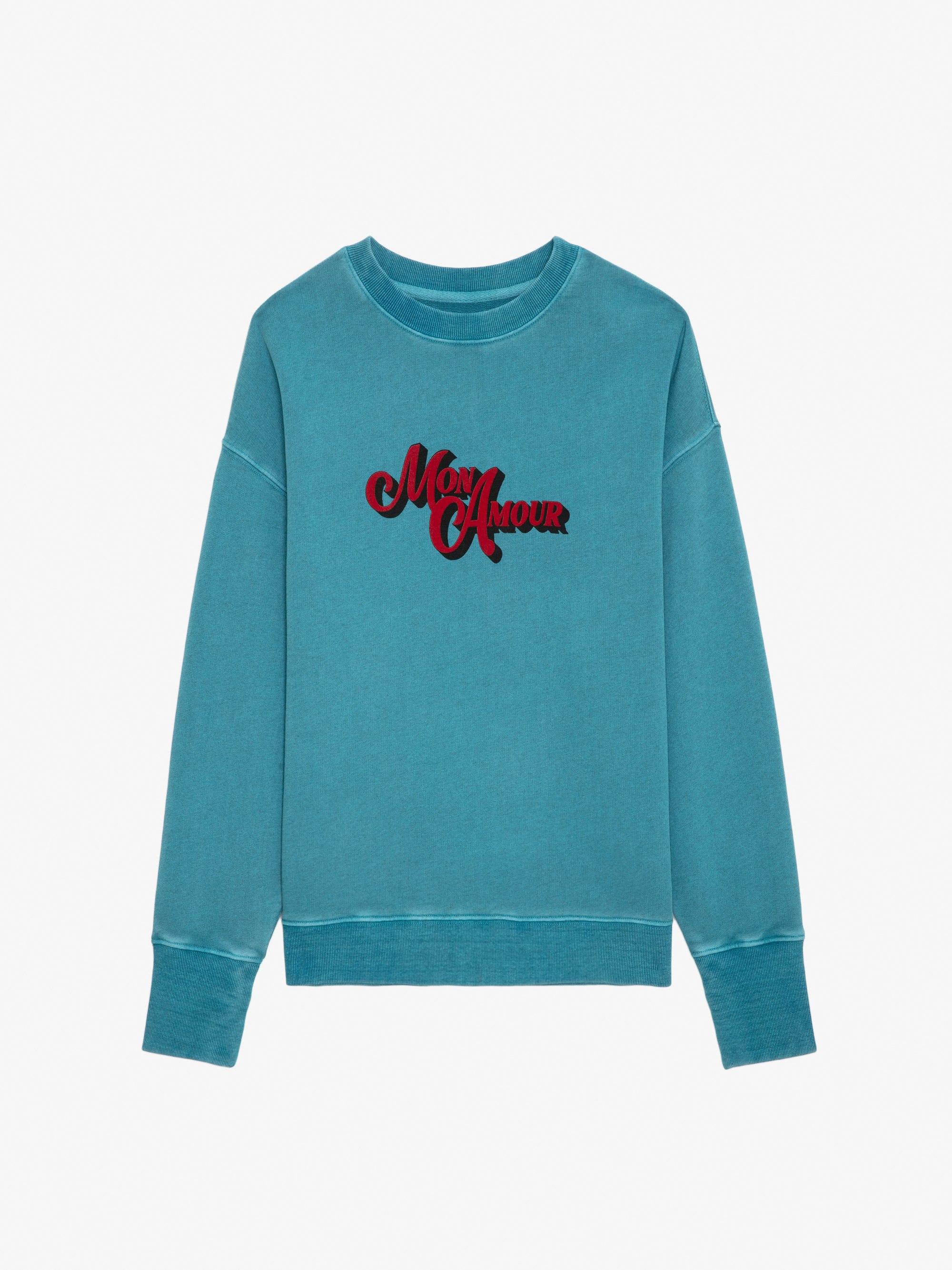 Long-sleeved baggy blue organic cotton sweatshirt with ‘Mon Amour’ print on the front.