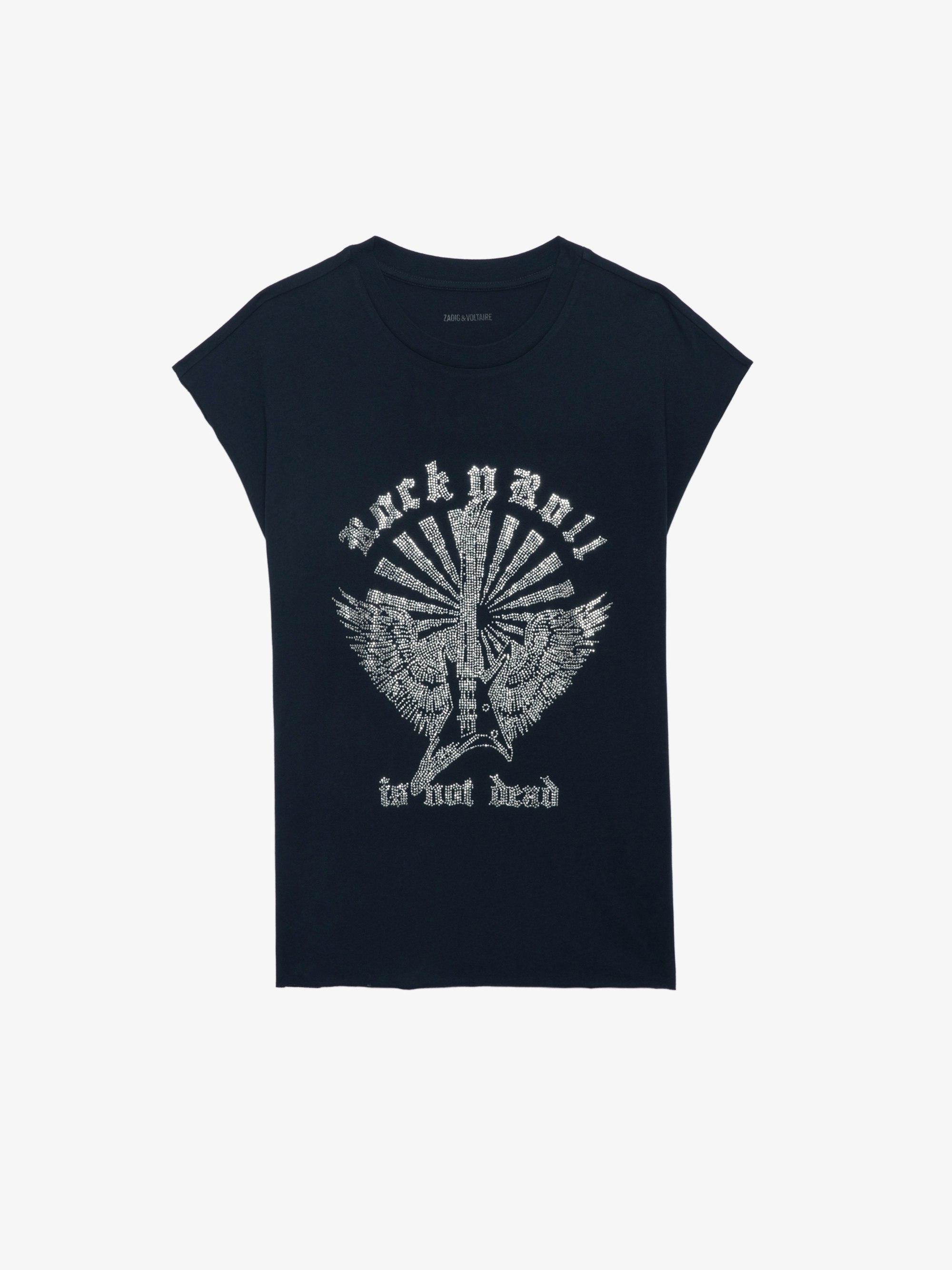 Navy blue organic cotton sleeveless top with short sleeves and guitar motifs, wings adorned with rhinestones.See more