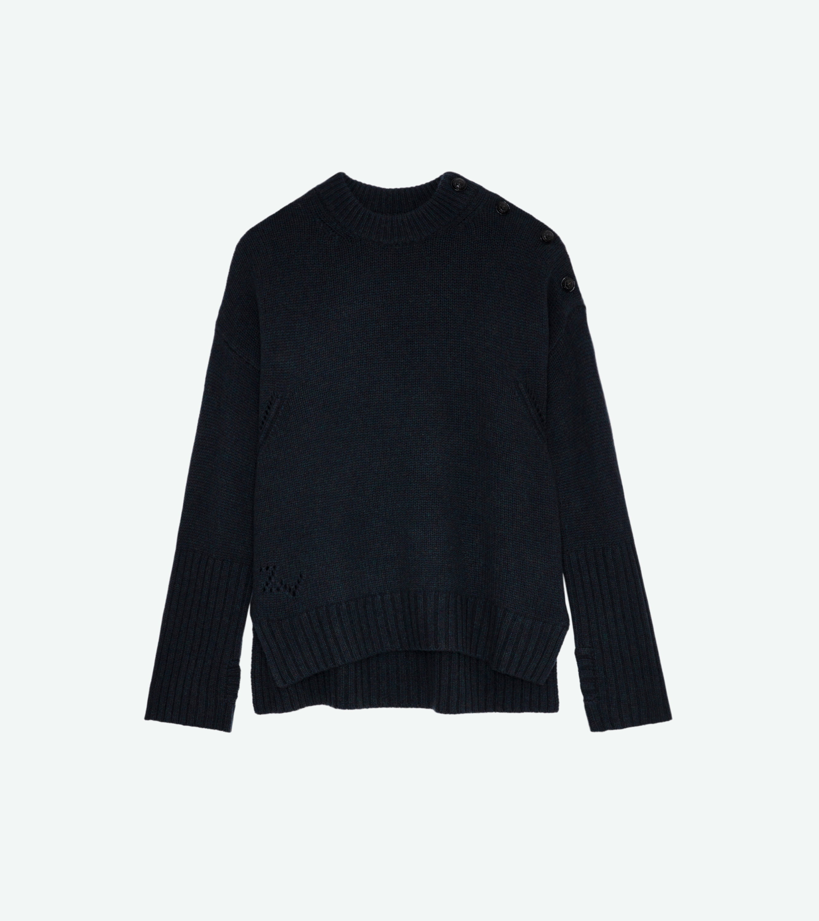 Women’s lovat green cashmere jumper with buttons on the shouldersSee more