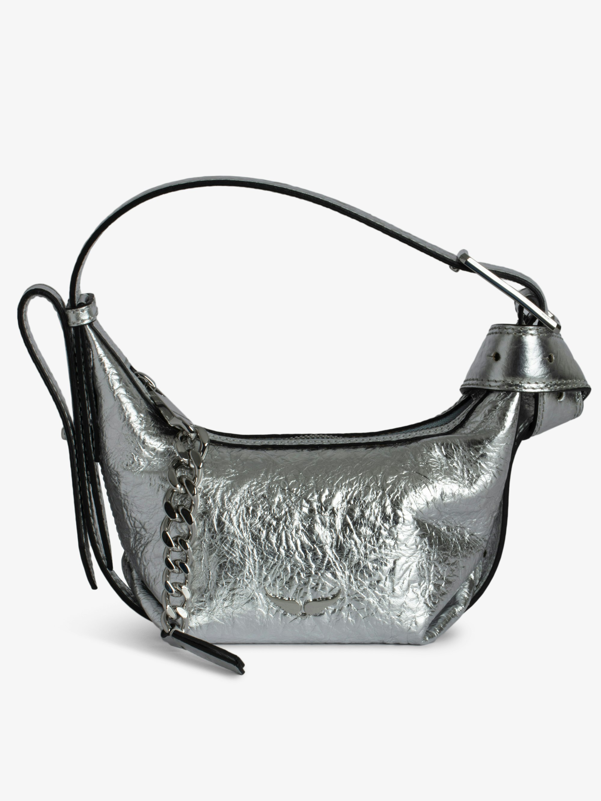 Small metallic silver leather bag with crinkle effect, shoulder strap and metal C buckle.