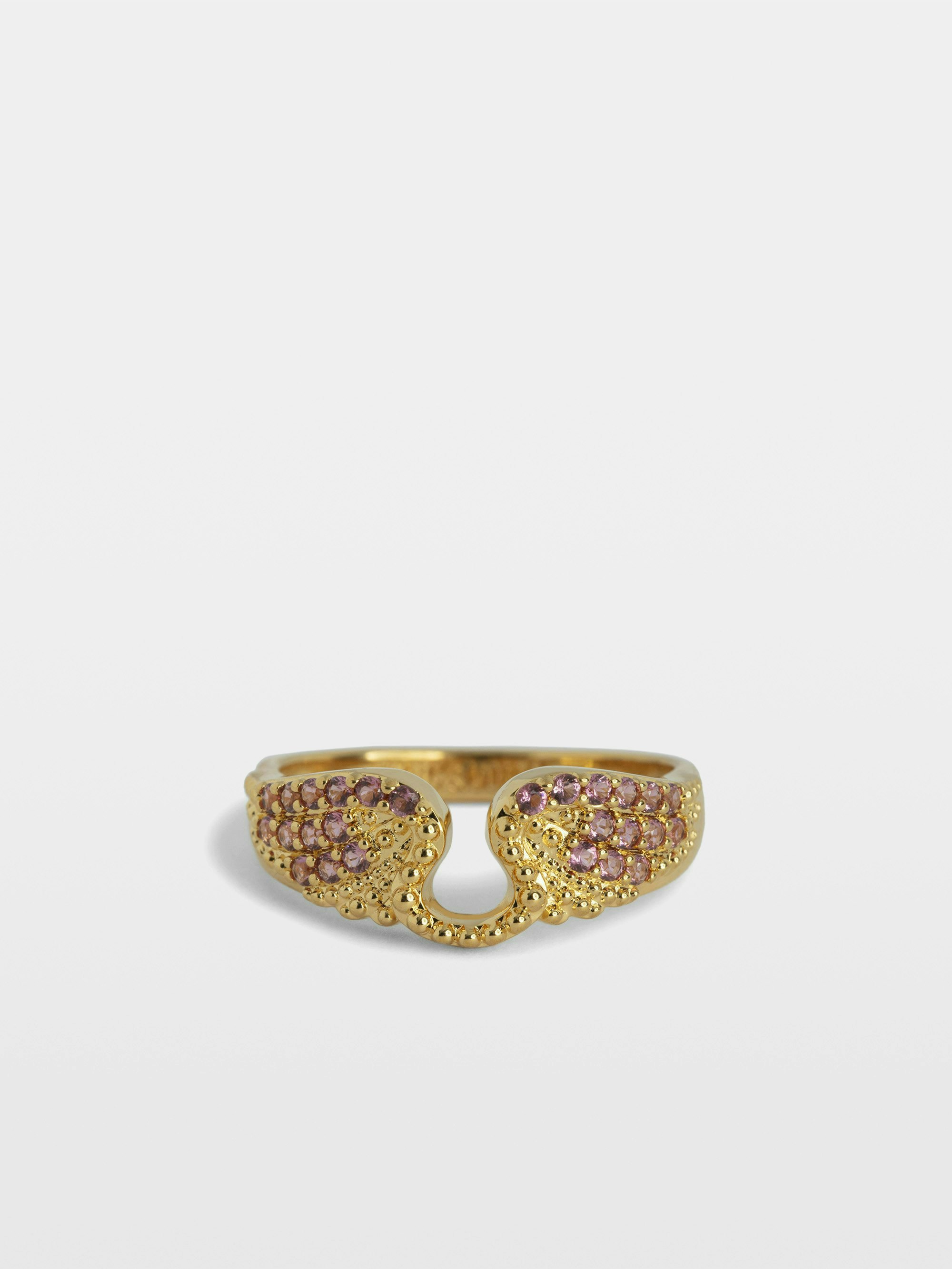 Brass ring with rhinestone-embellished wings.