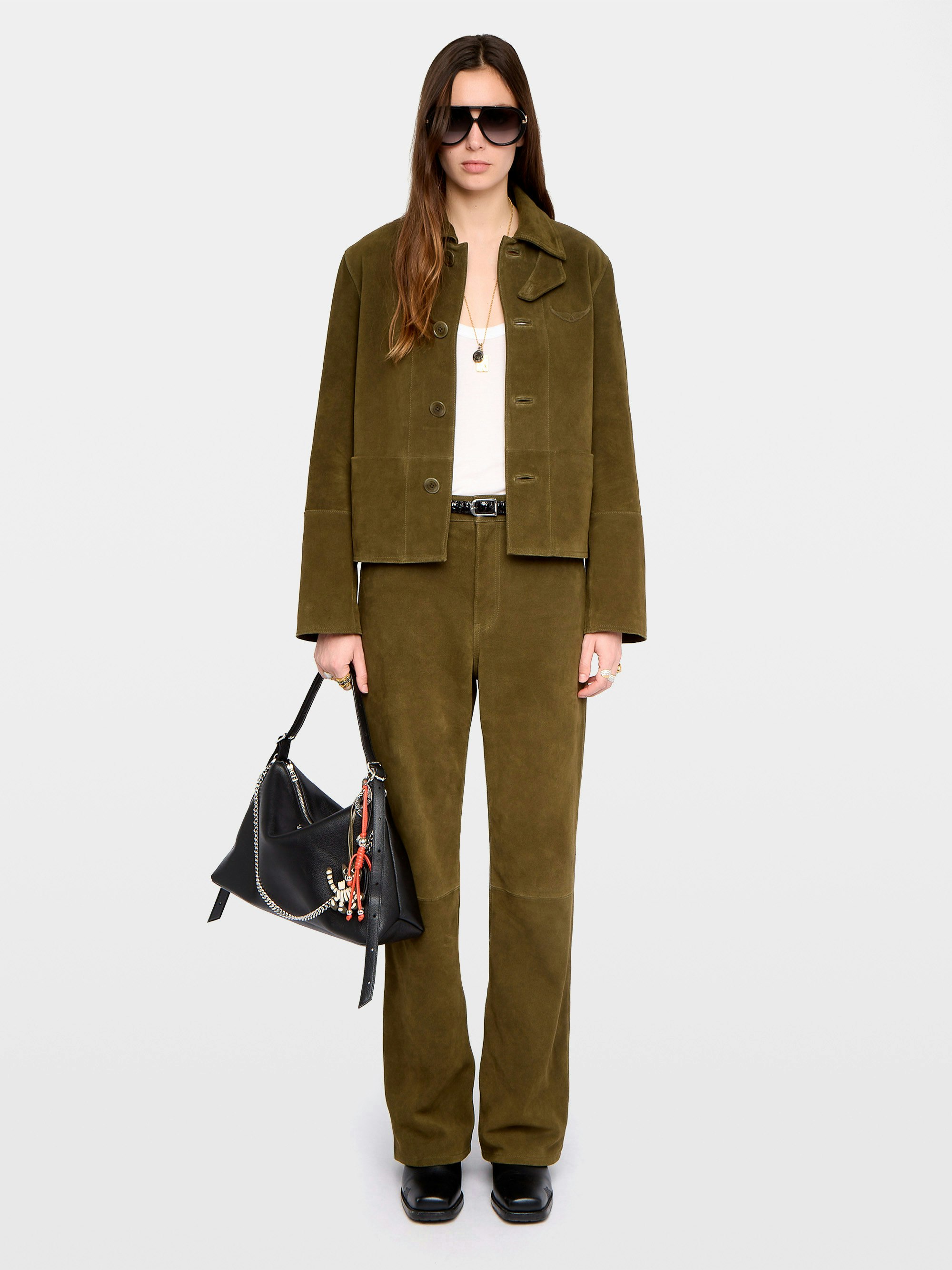 Short buttoned jacket in suede leather with deep dye effect and embossed wing.