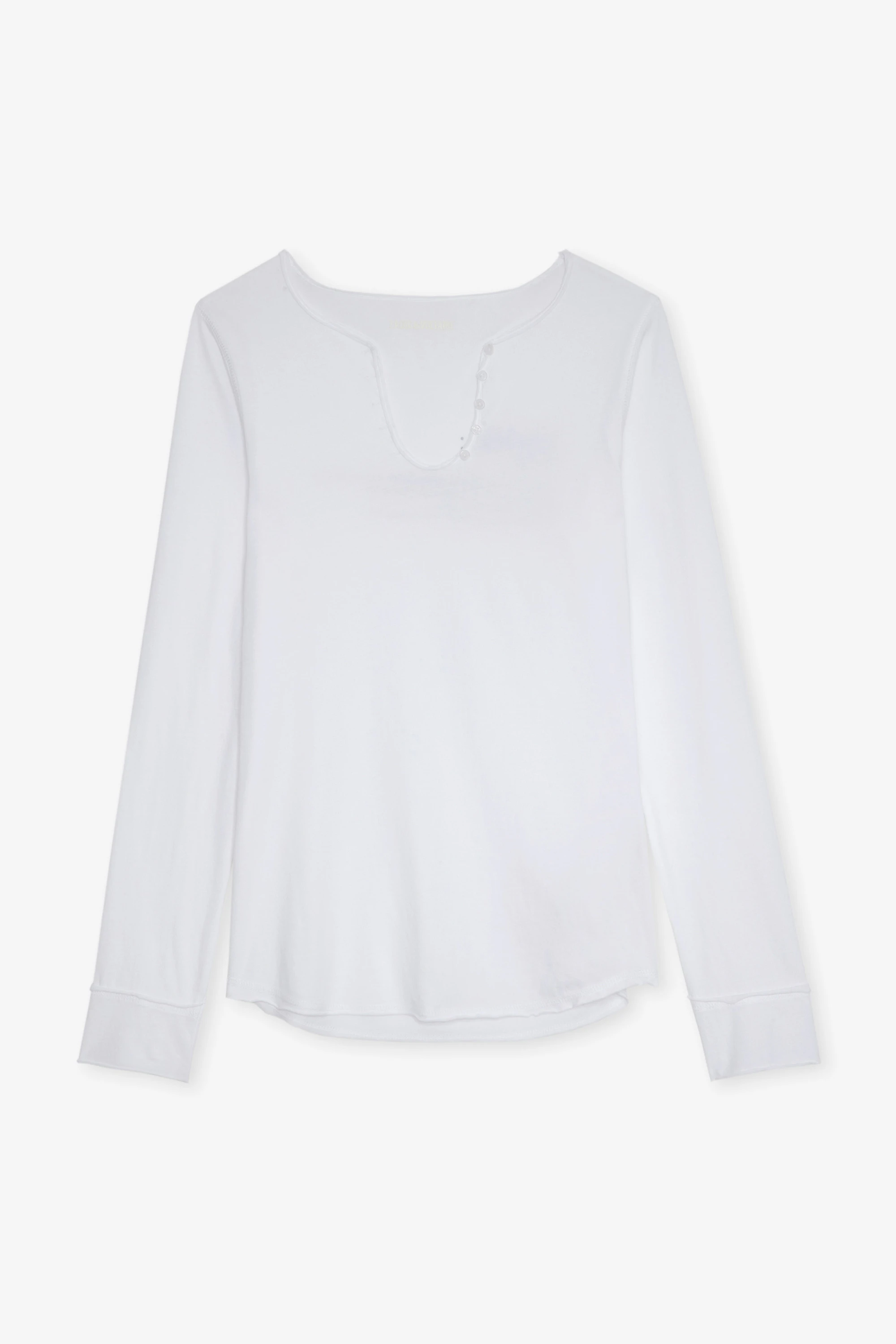 Women’s long-sleeved white cotton Henley T-shirt with “Karlek” definition print on the back.See more