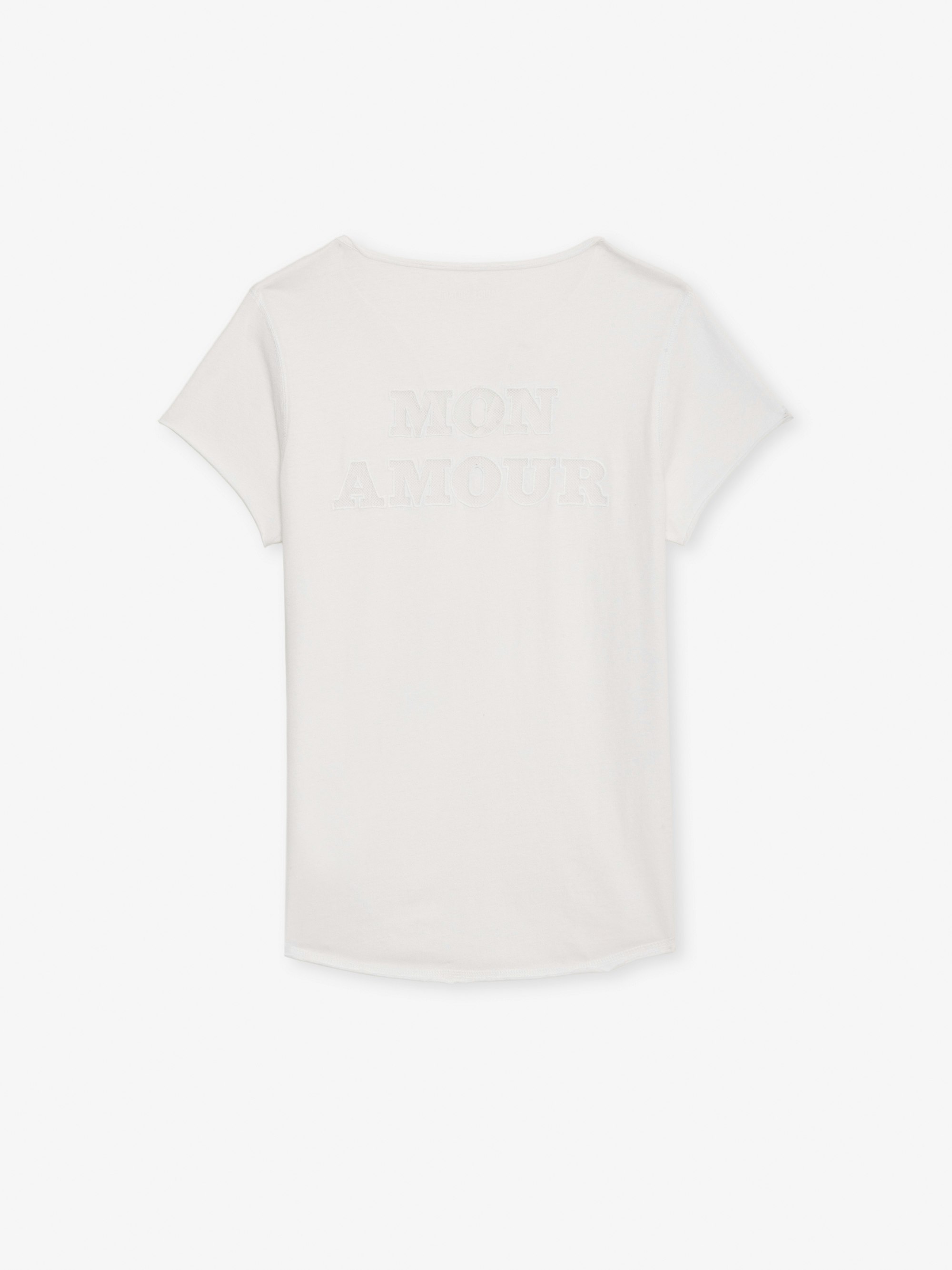 Short-sleeved white organic cotton Henley T-shirt with ‘Mon Amour’ embroidered on the back.