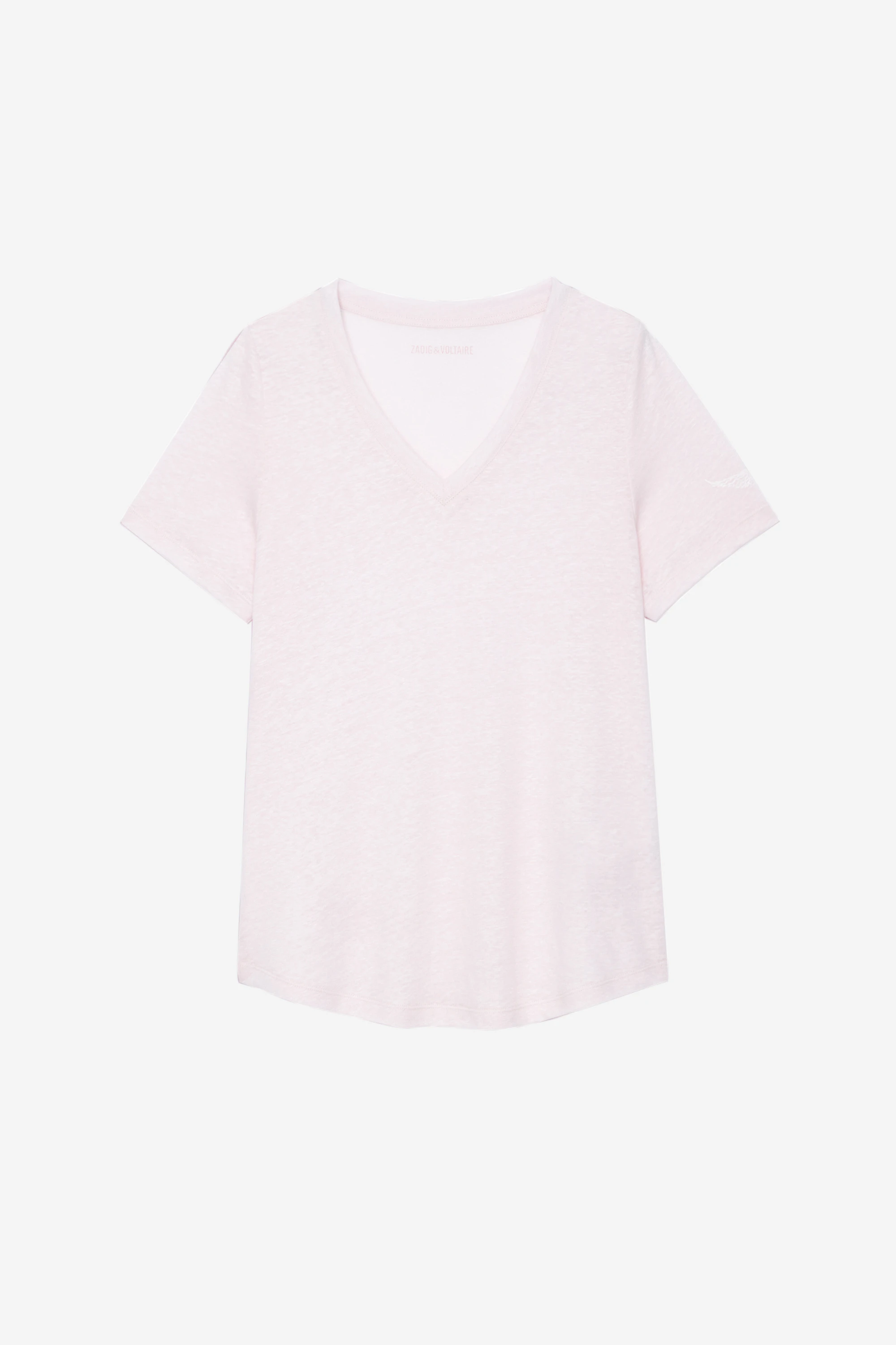 Women’s light pink linen T-shirt with wings motif on the left sleeve.See more