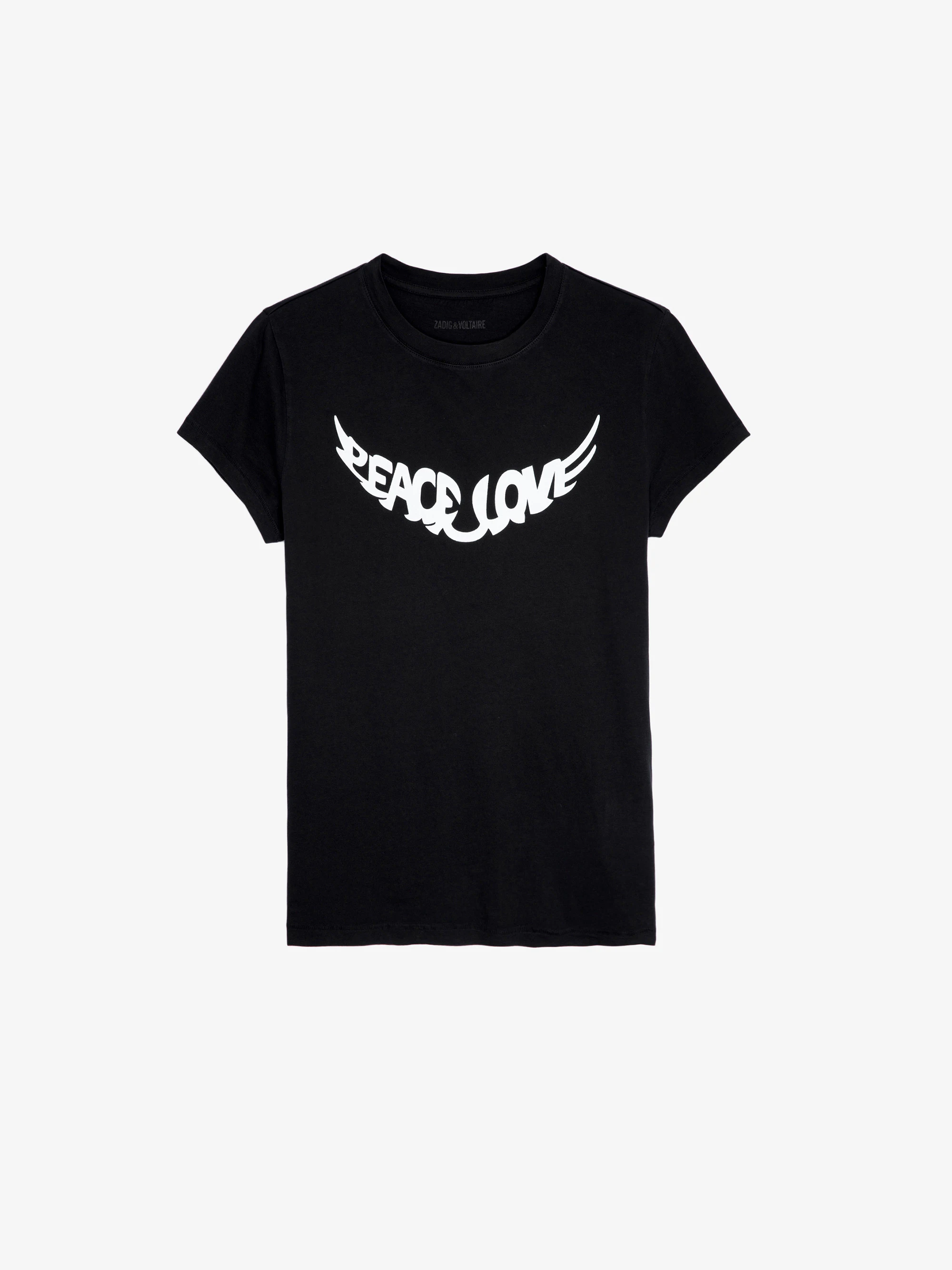 Women’s black cotton T-shirt with wing-shaped “Peace & Love” slogan.See more