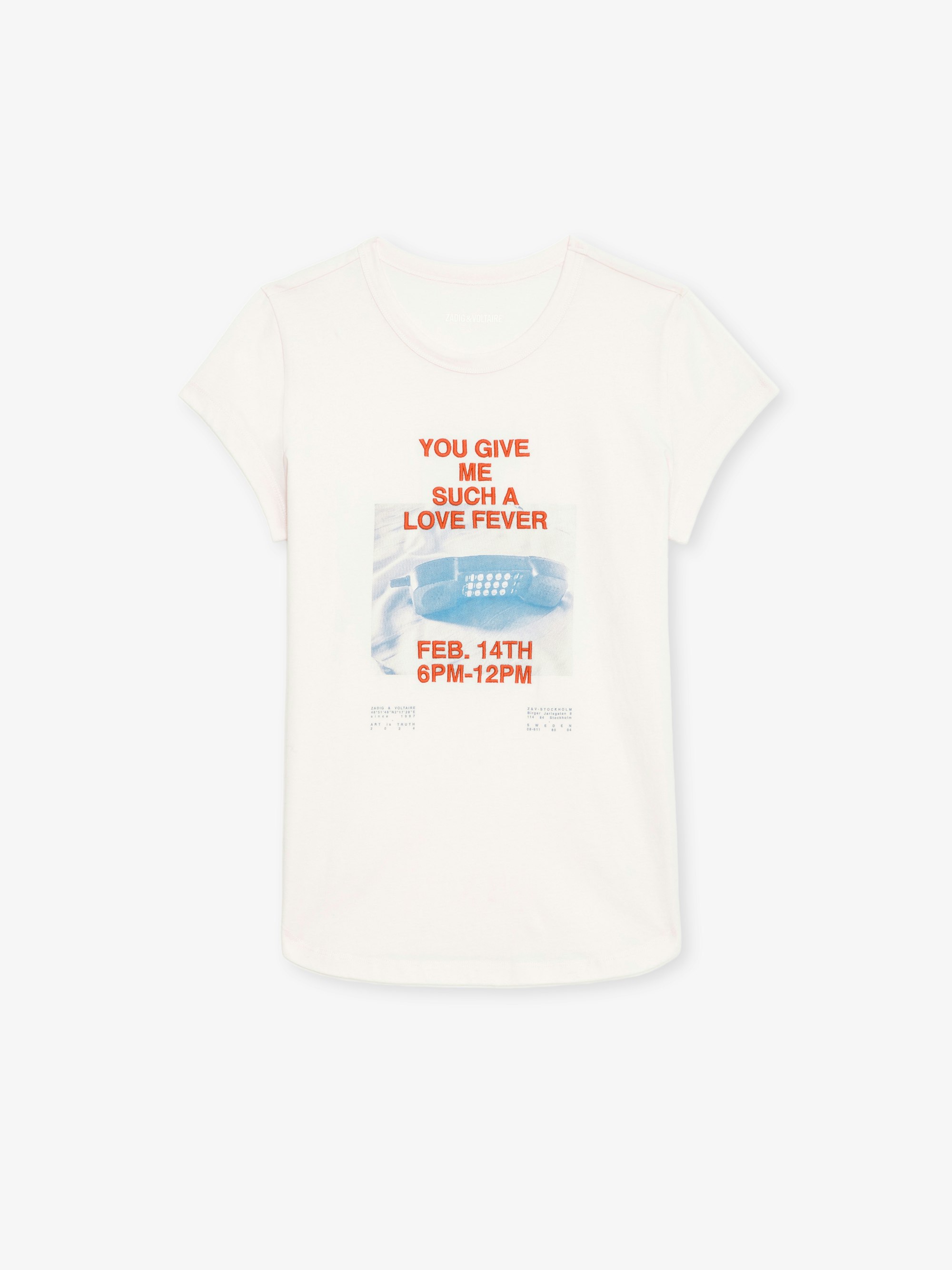 Short-sleeved, pale pink organic cotton T-shirt with Concert photoprint and embroidery on front.