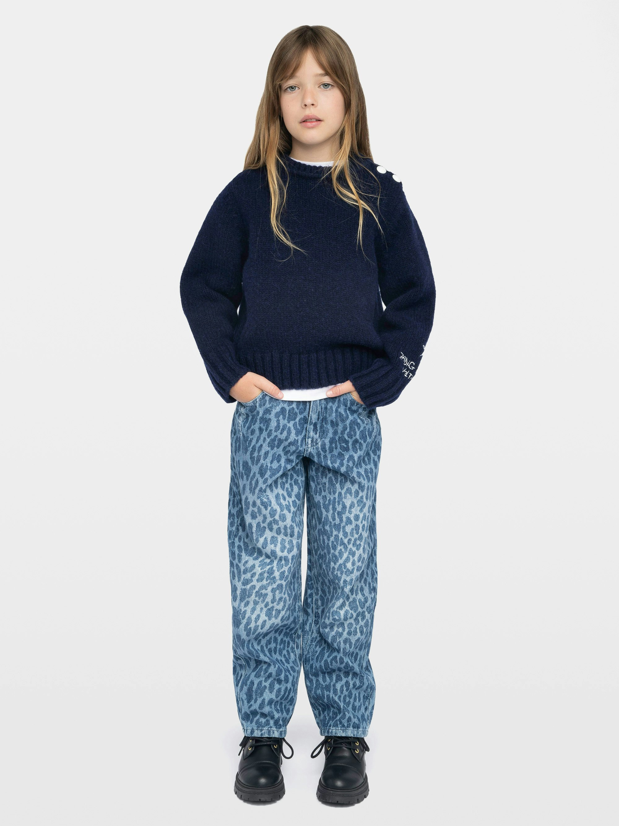 Wool jumper, round neck and buttoned opening on the shoulder, fancy logo embroidered on the sleeve.