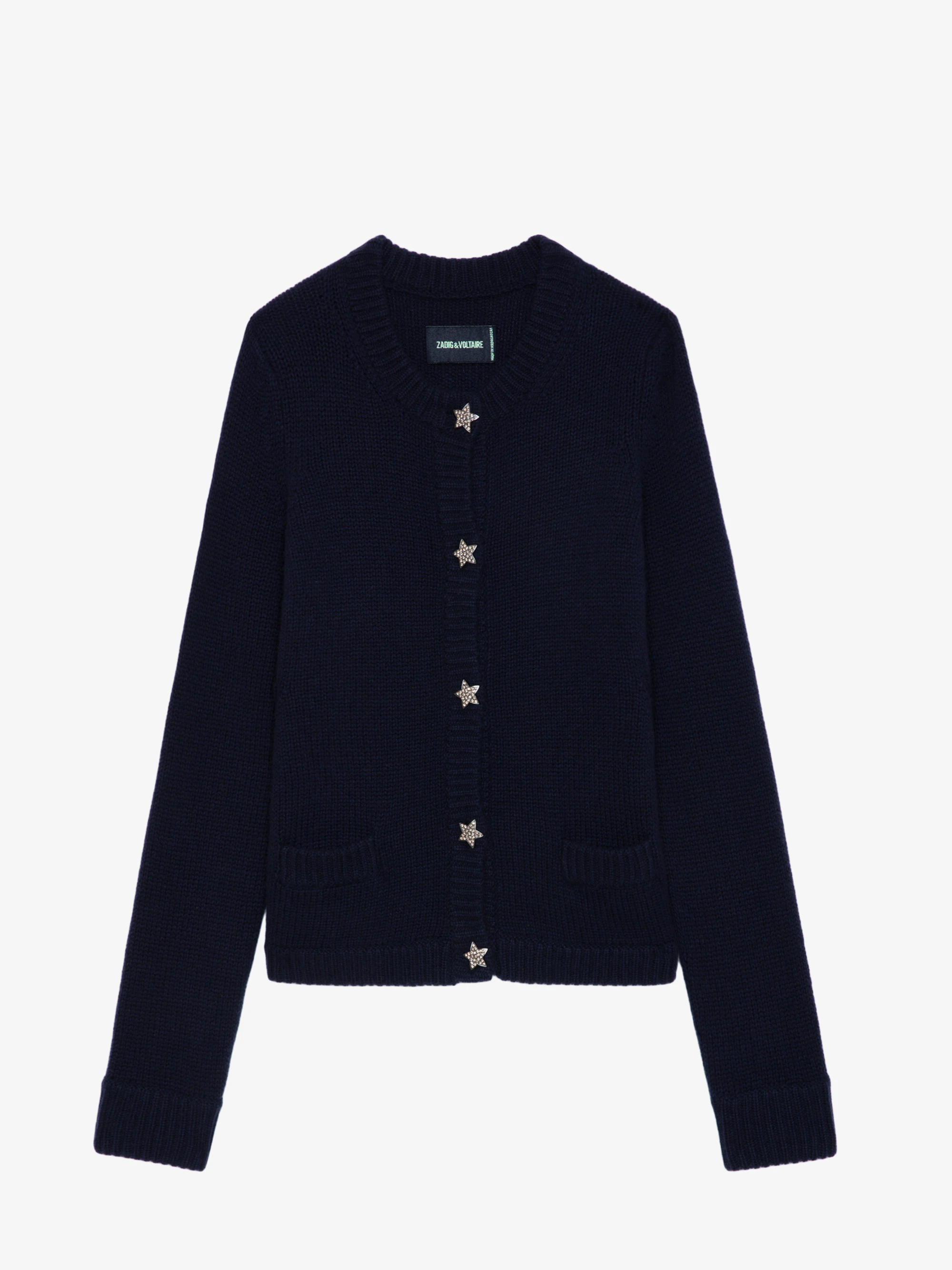 Navy blue 100% cashmere cardigan with pockets and star buttons embellished with diamanté.See more