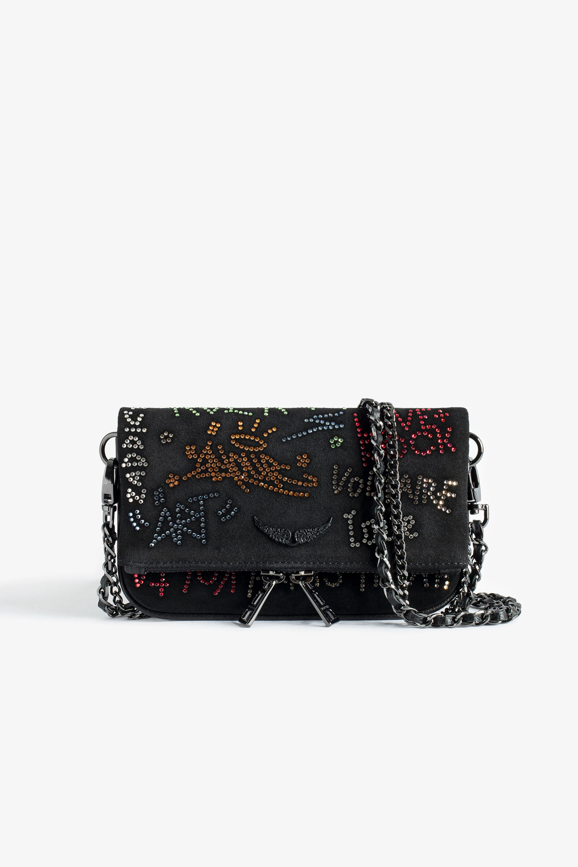 Women’s small black suede clutch with Swarovski® rhinestones tags.