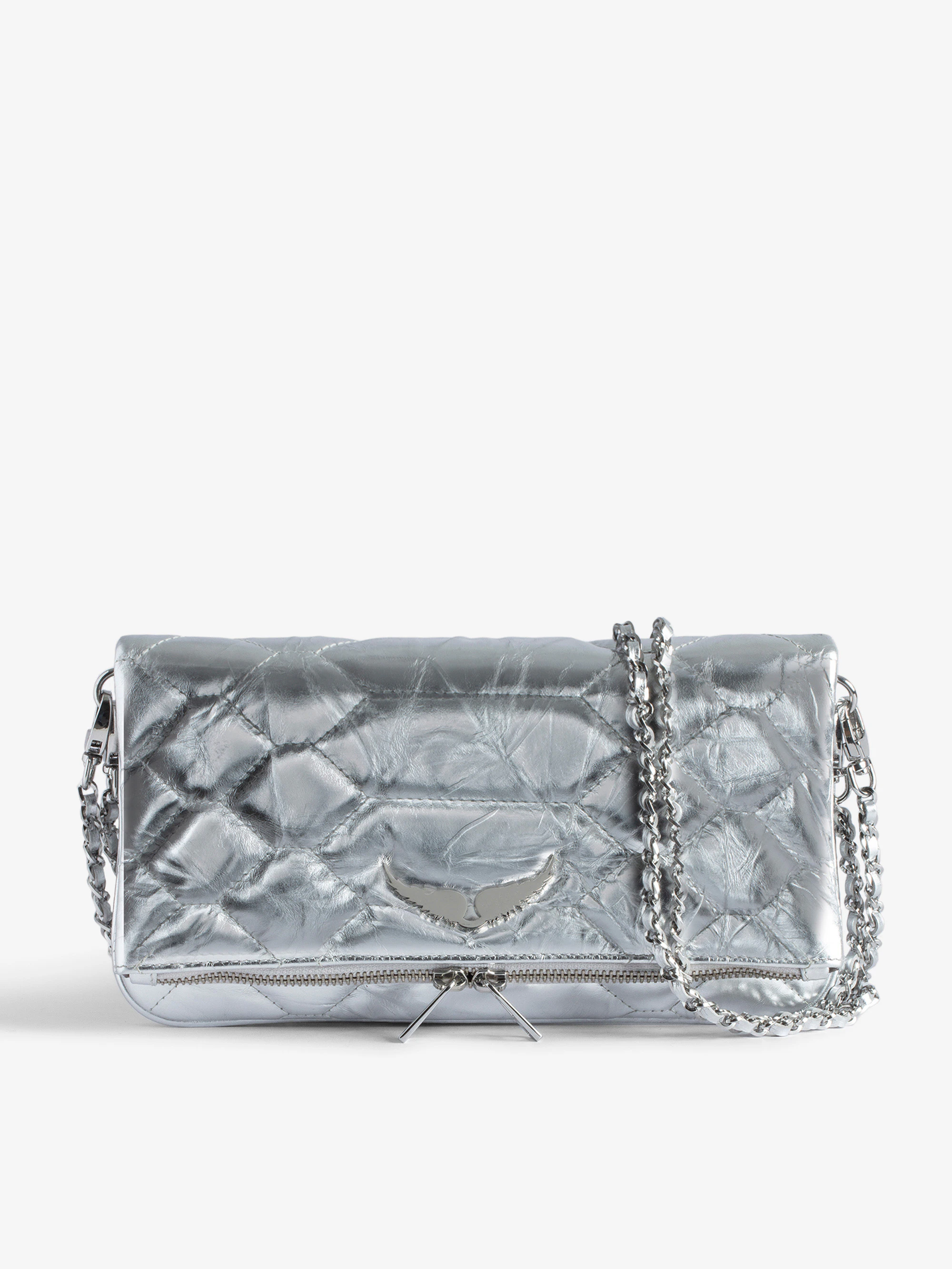 Rock silver snakeskin-effect metallic, crinkled, quilted leather clutch with double leather and metal chain.See more