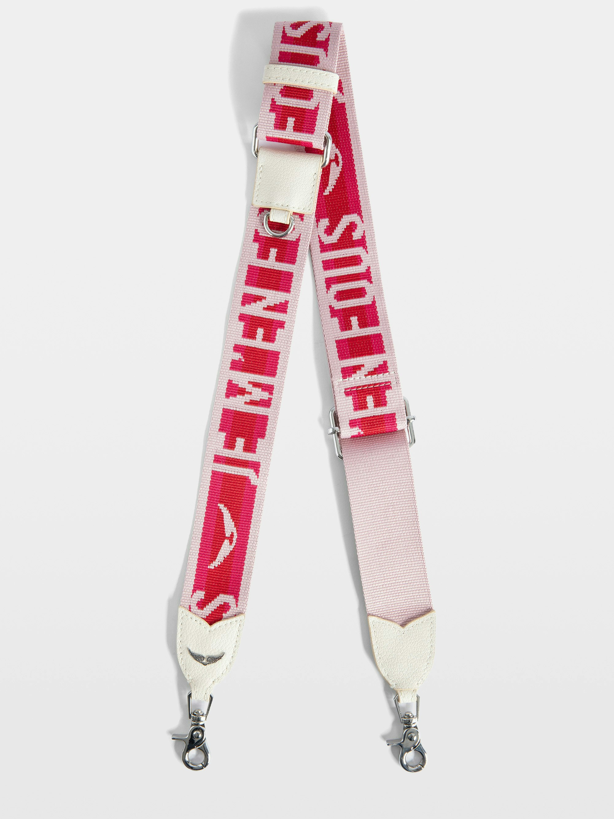 Leather and nylon shoulder strap with "Je m'en fous" message and wings motif.