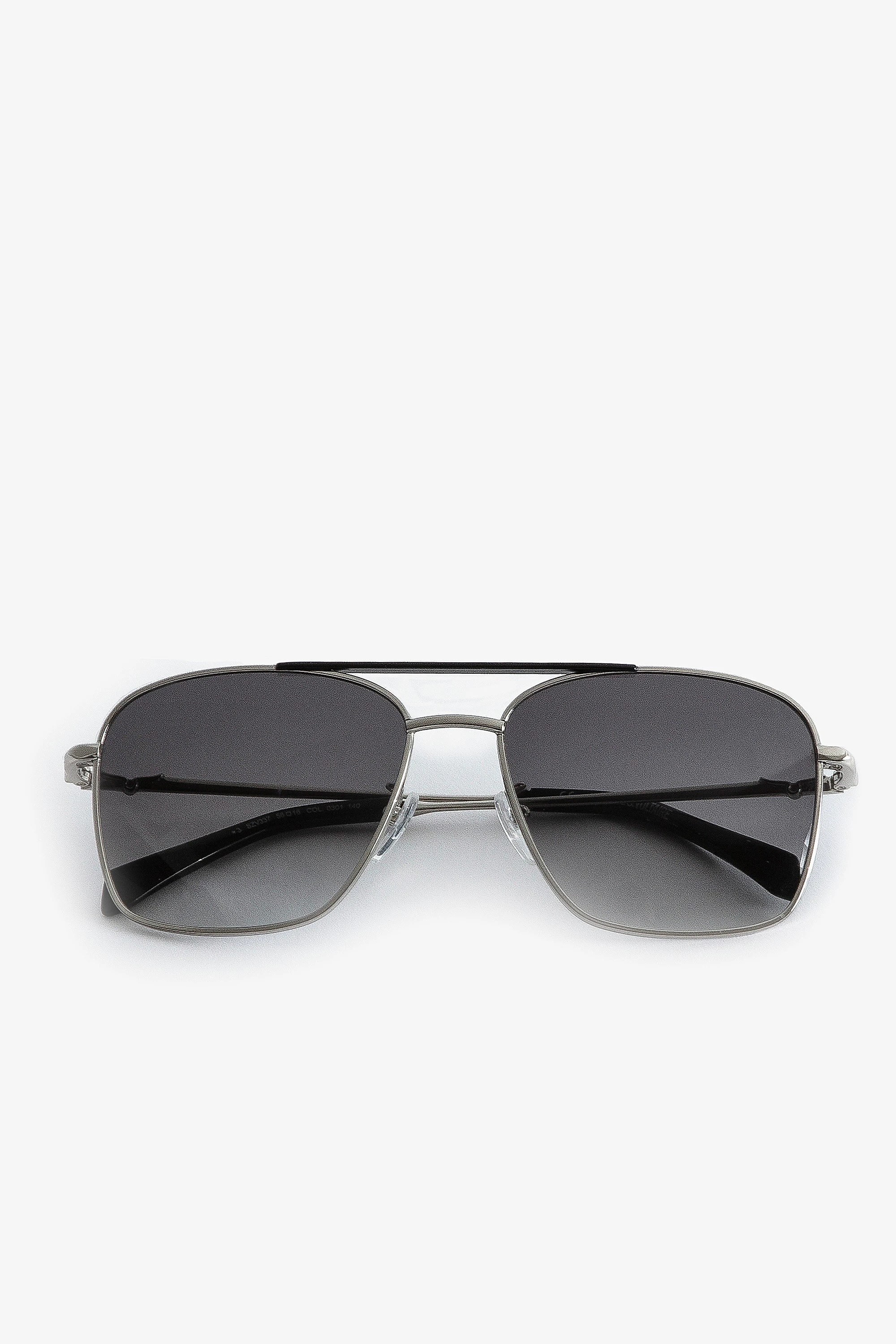 Unisex aviator sunglasses in black metal with smoke lenses.