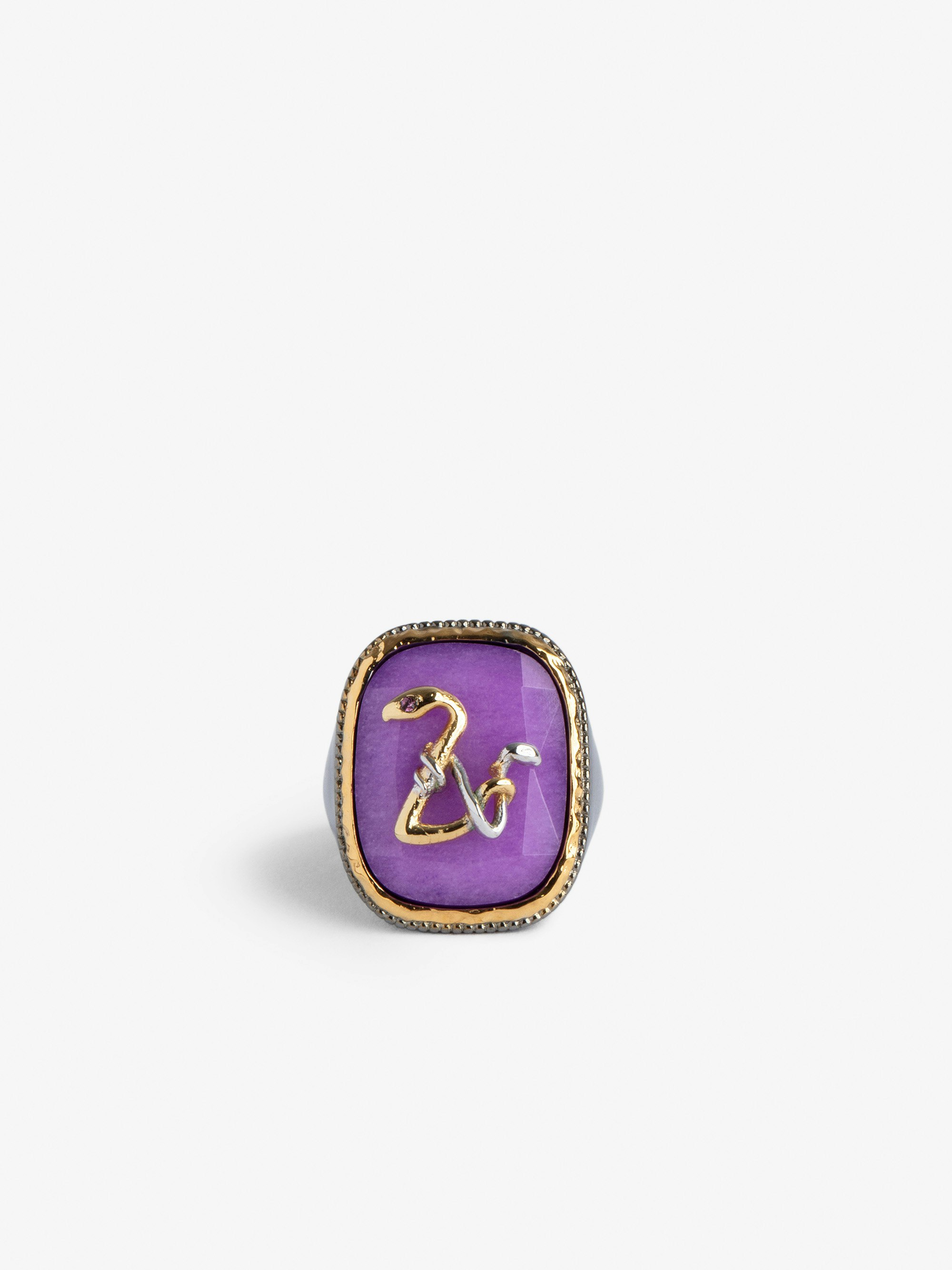- Purple signet ring with ZV Snake in gold-tone brass.