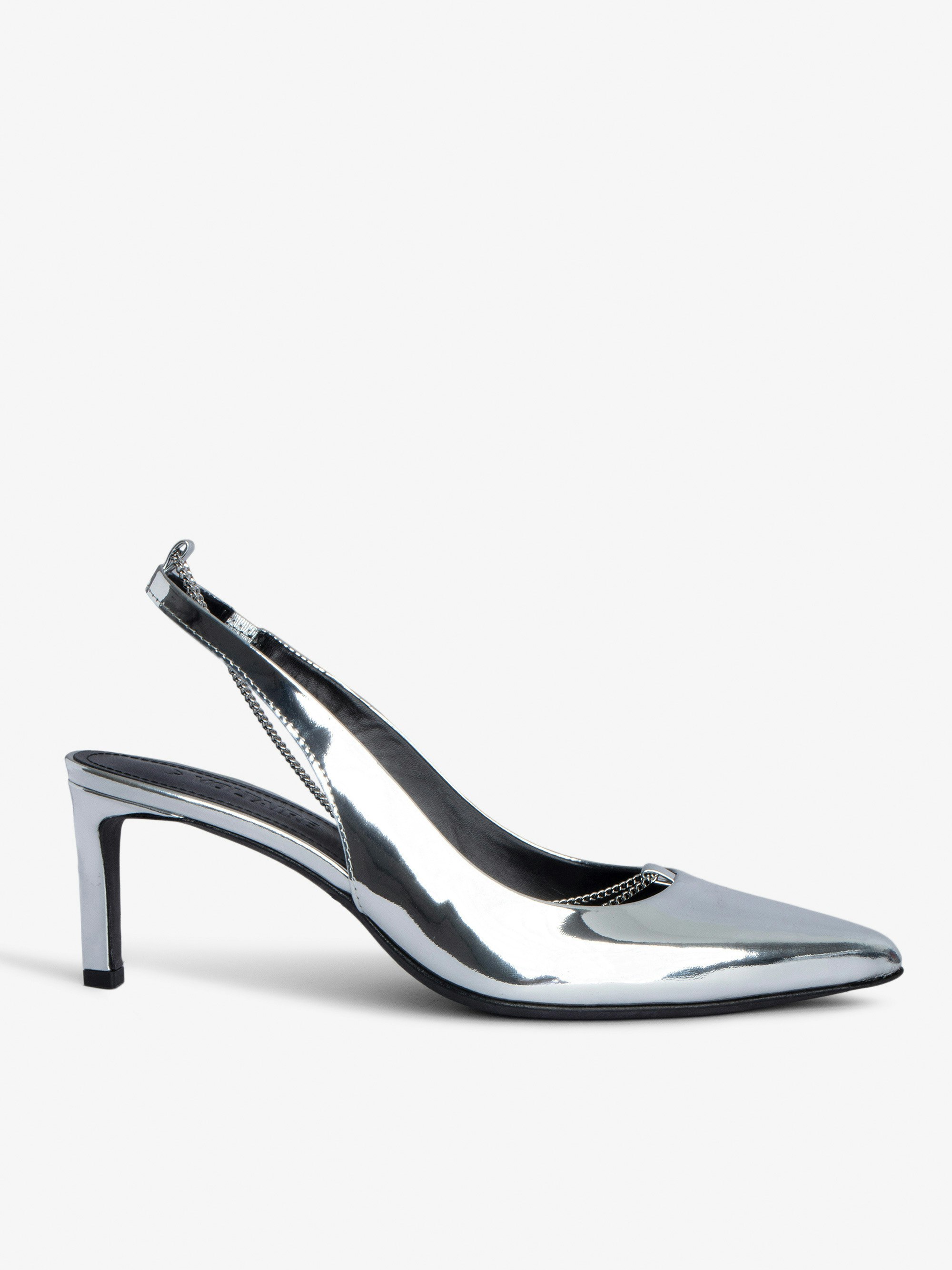 Mirror-effect leather court shoes in silver tone with leather strap and metal chain.