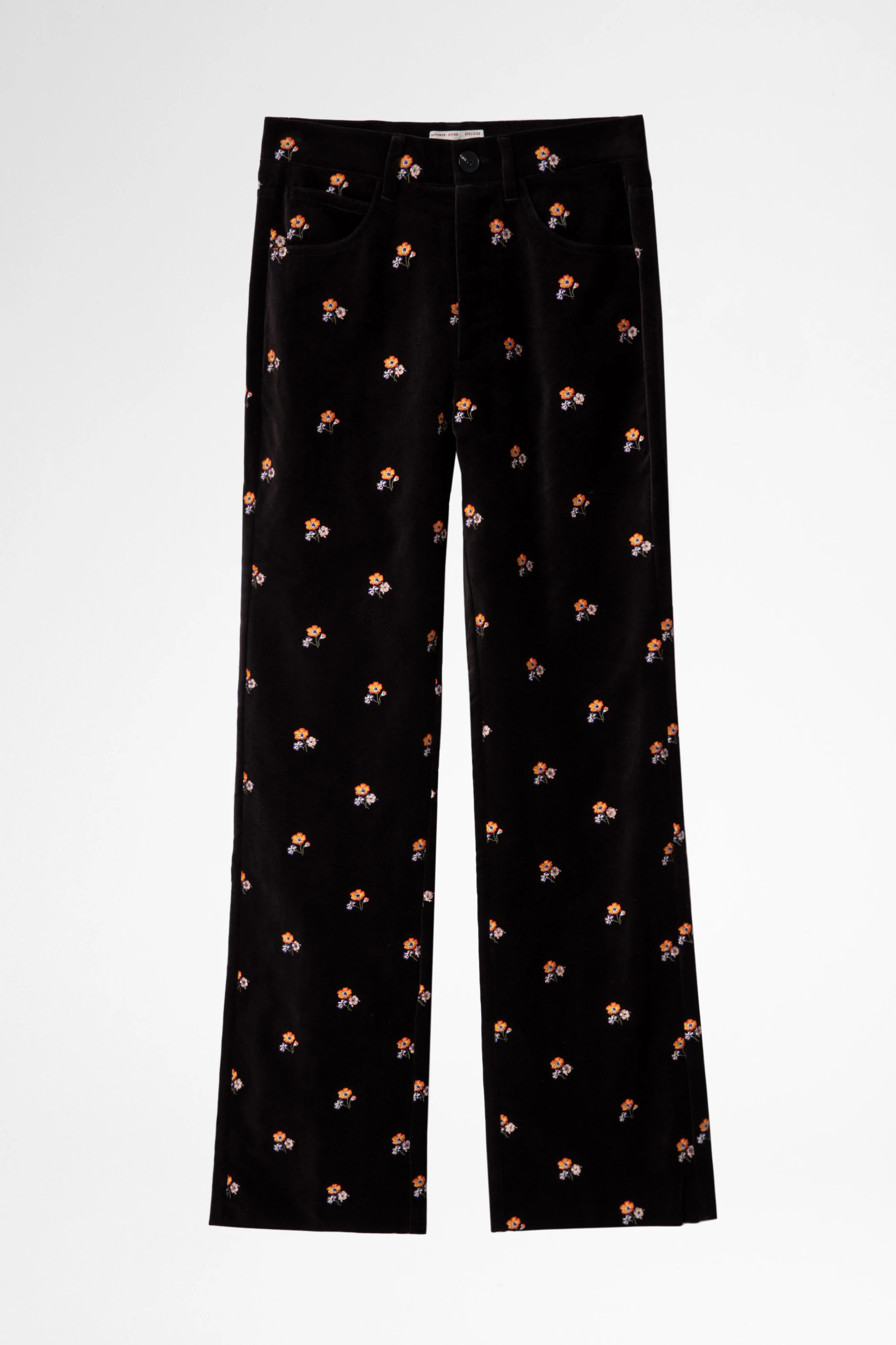 Velvet trousers adorned with a delicate floral pattern.