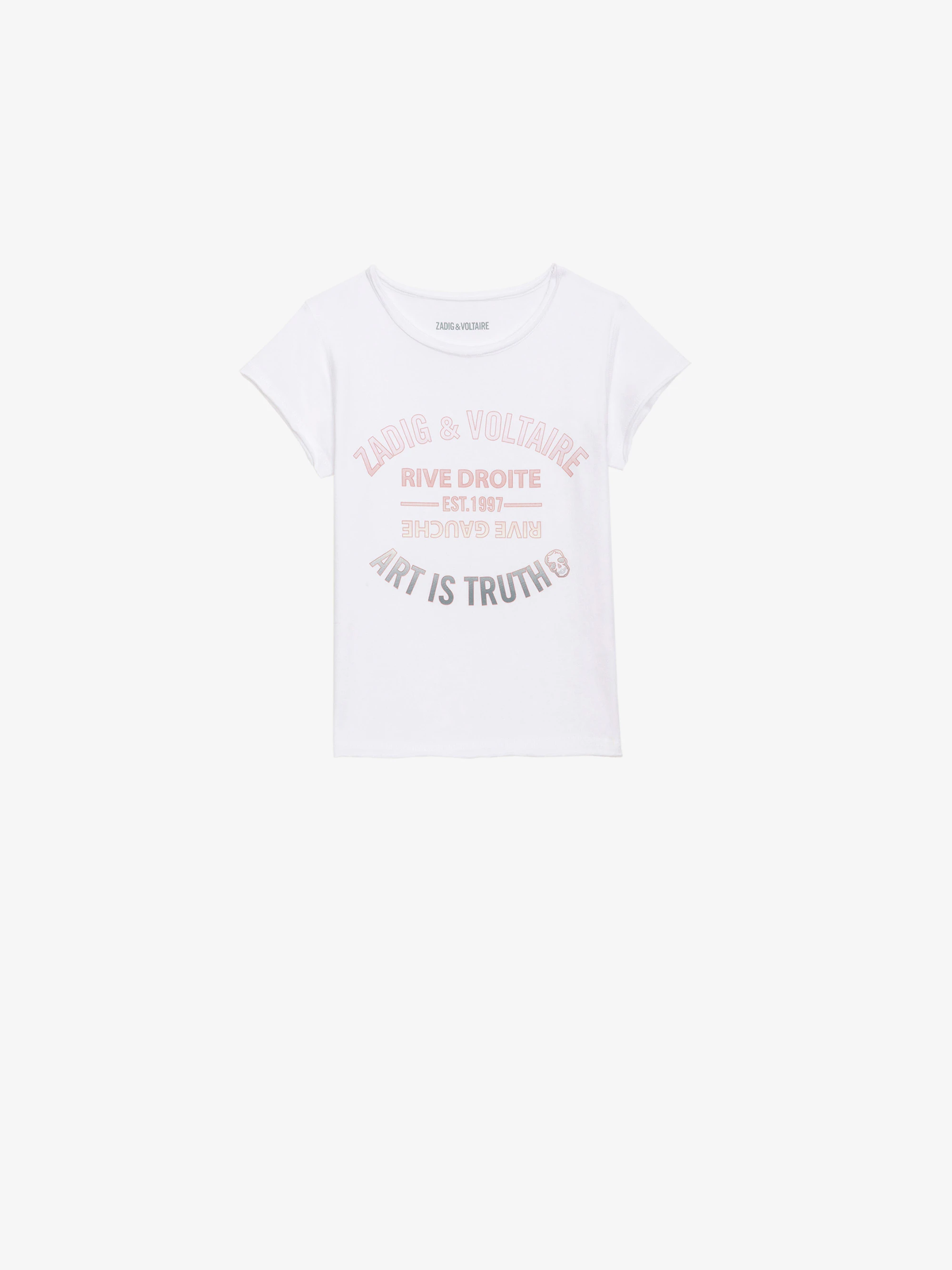 Weißes Mädchen-T-Shirt mit kurzen Ärmeln aus Baumwolljersey mit Wappen-Label.Mehr sehen