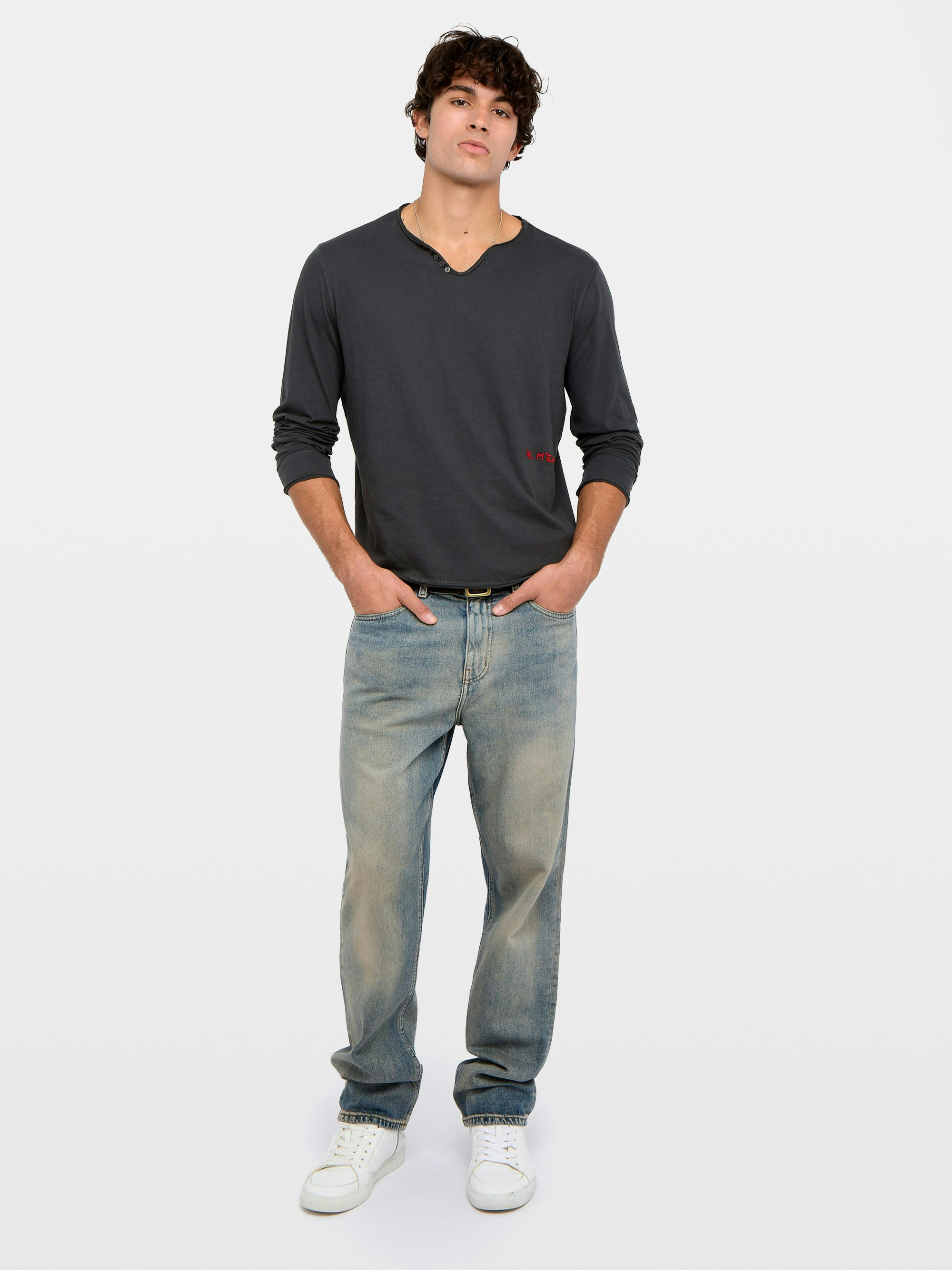 Henley-Shirt mit langen Ärmeln und Stickerei auf der Vorderseite.