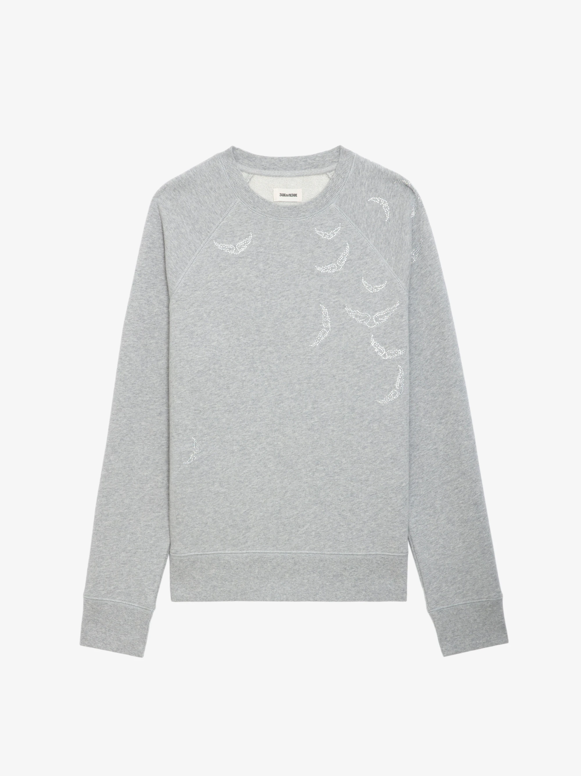 Langärmeliges, graues Sweatshirt aus Bio-Baumwolle mit strassverzierten Flügeln auf Vorderseite und Schulter.Mehr sehen