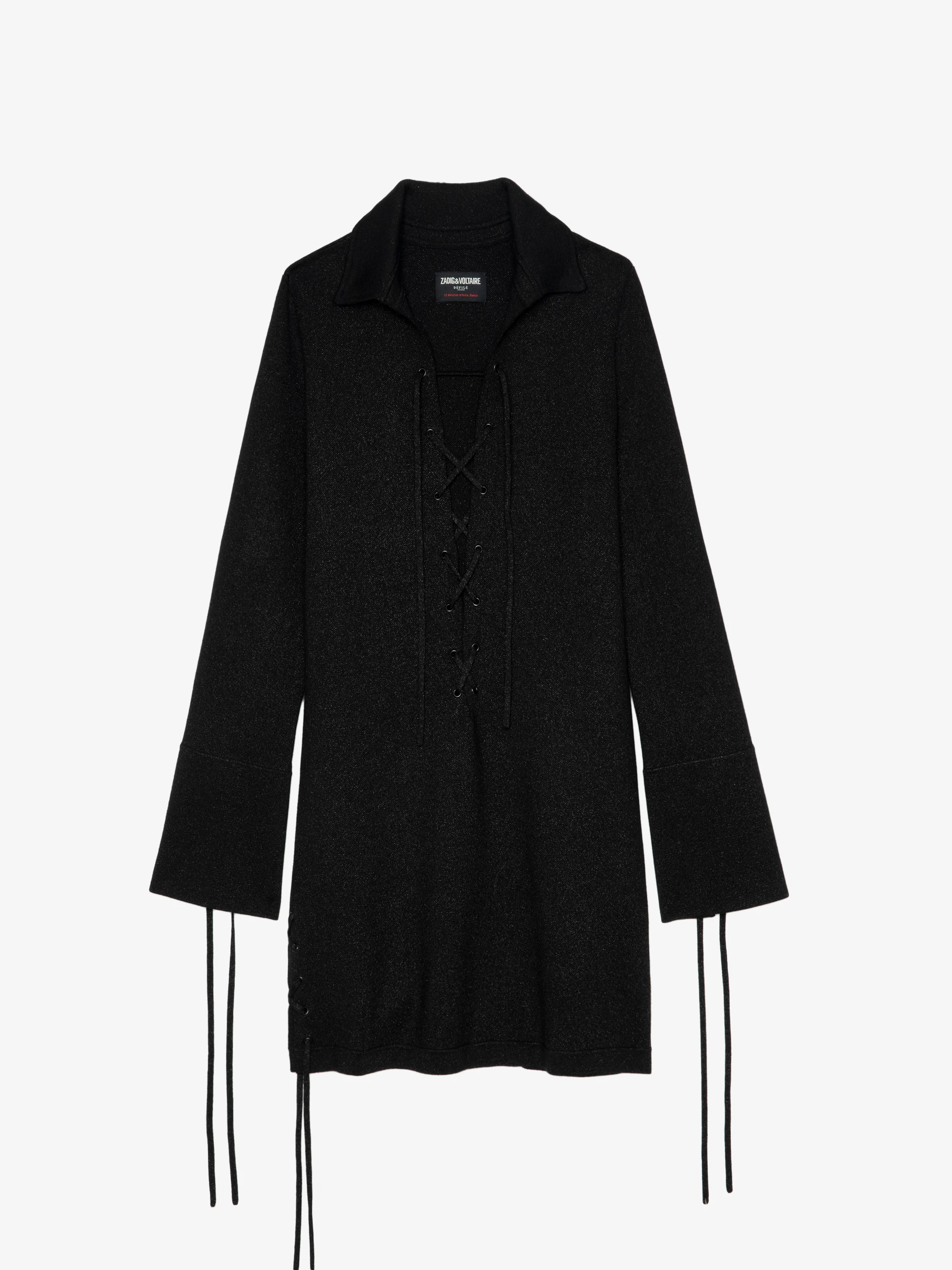 Langes Lurex-Kleid mit Hemdkragen, Ösen und seitlicher Schnürung.