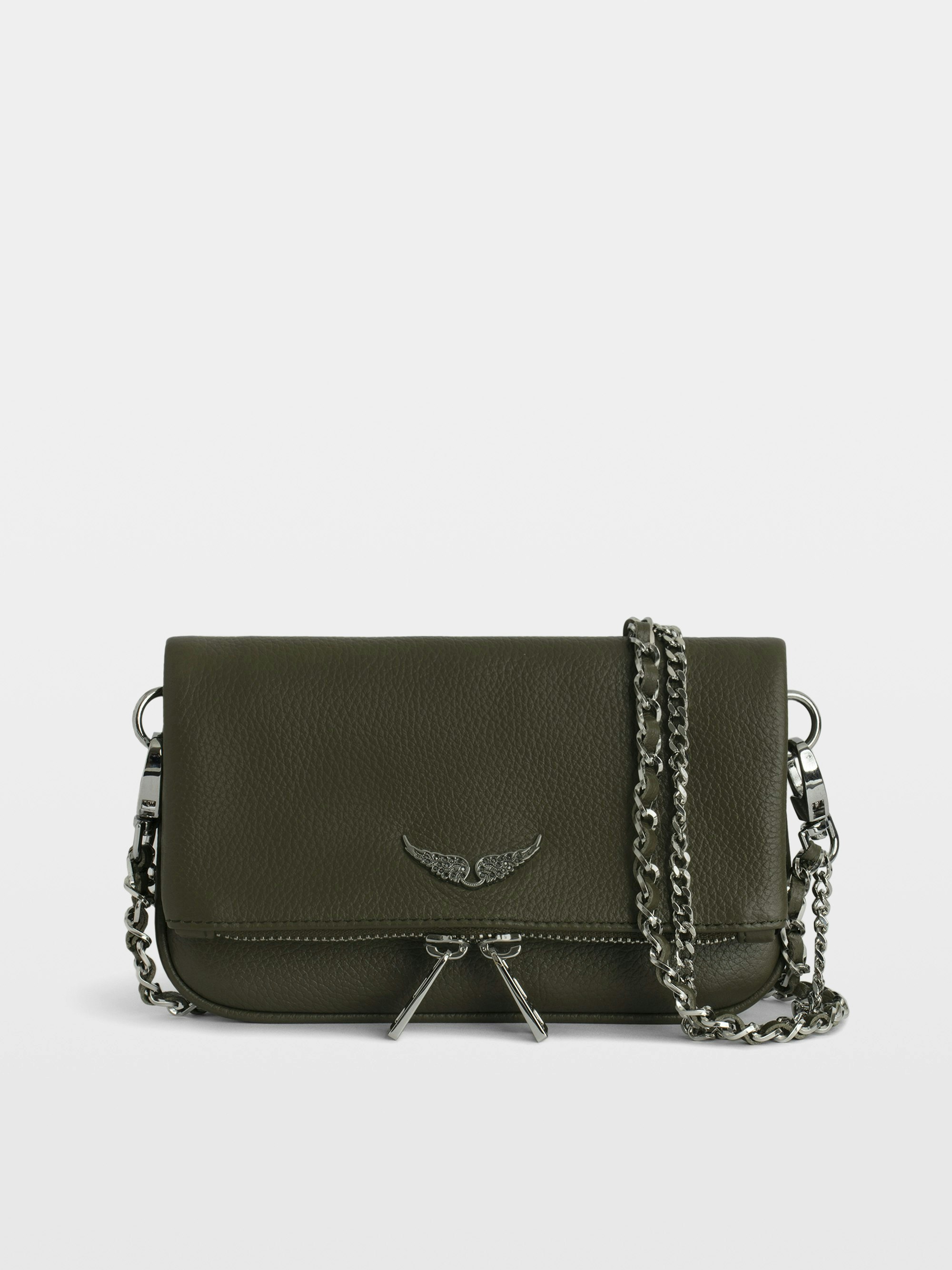Kleine Tasche aus grünlichem genarbtem leder mit doppelter Kette und Strassflügeln.