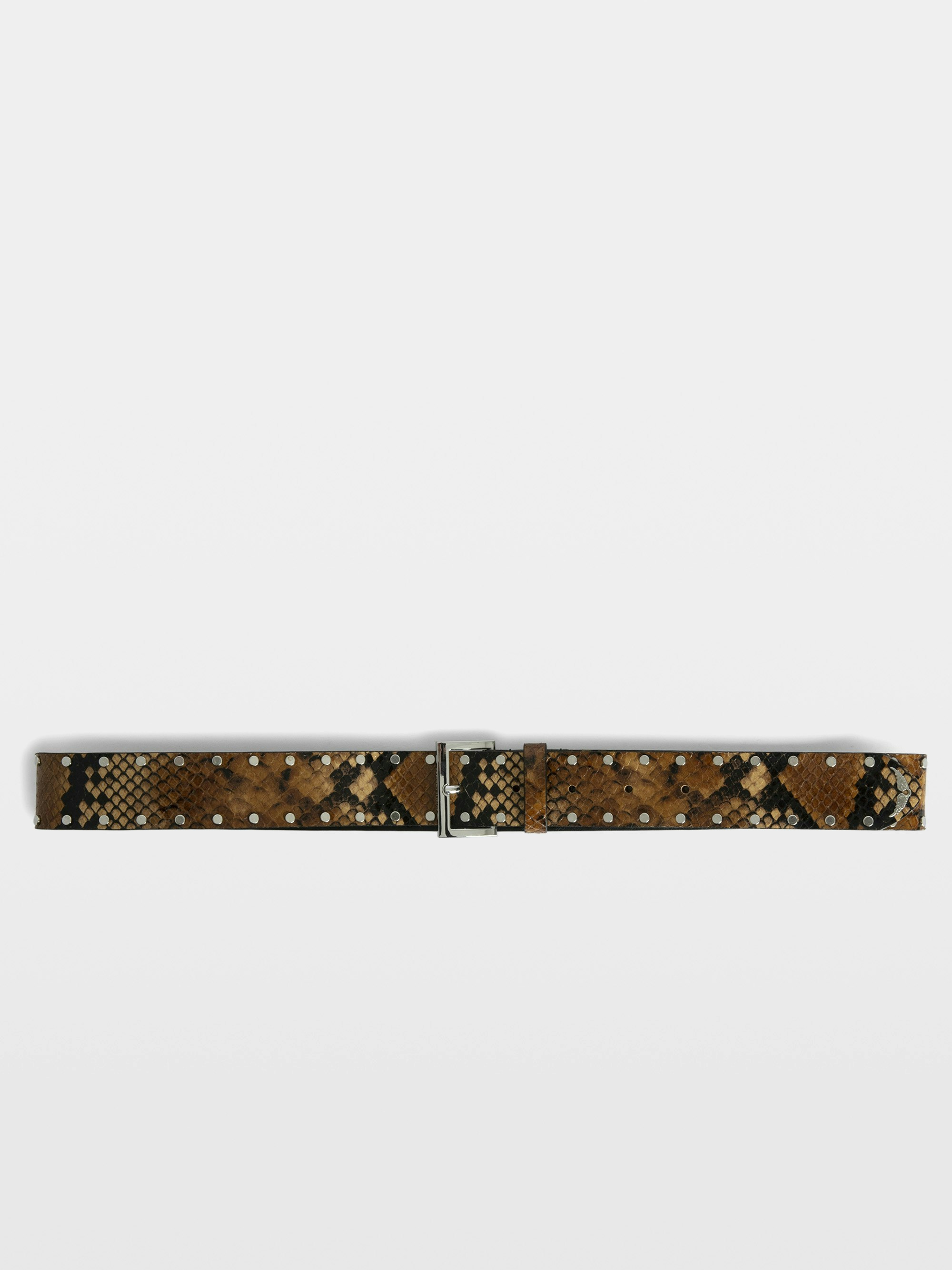 Ledergürtel mit Schlangeneffekt und Nietenbesatz.