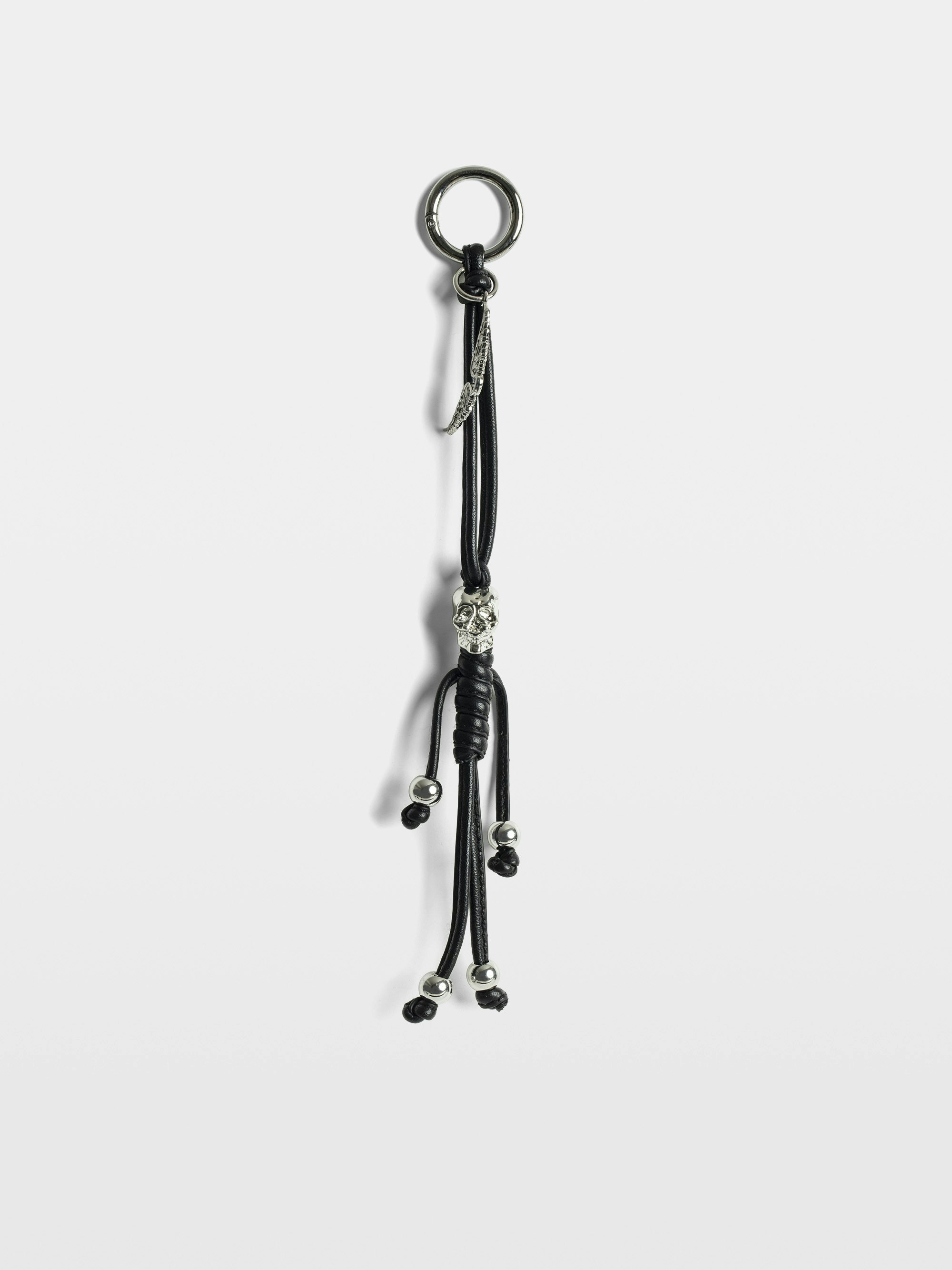 Grigri-Anhänger aus glattem Leder in Skelettform zum Anhängen an eine Tasche, zum Beispiel.
