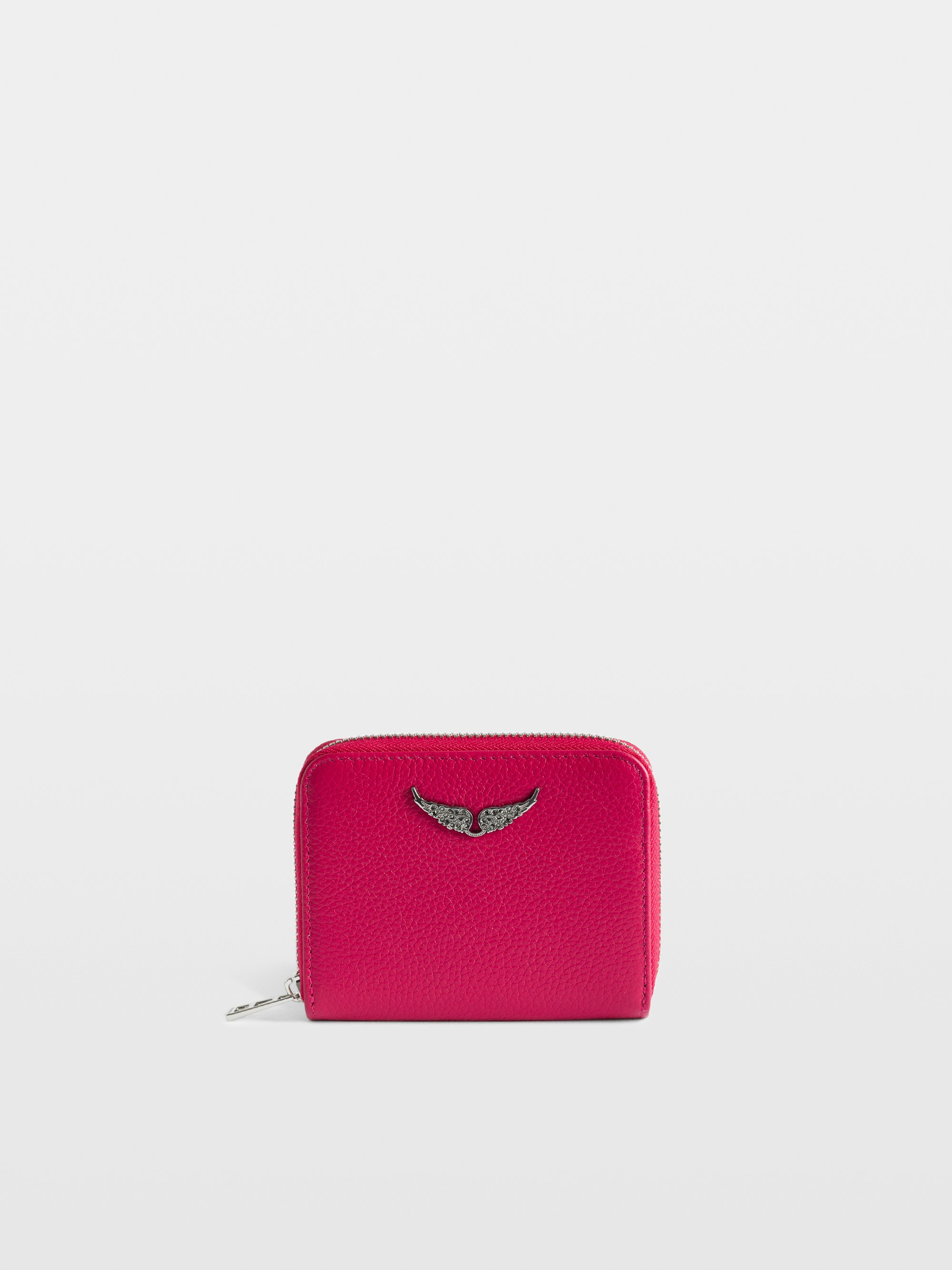 Brieftasche aus rosafarbenem genarbtem Leder mit Flügel-Charm aus Strass für Damen.