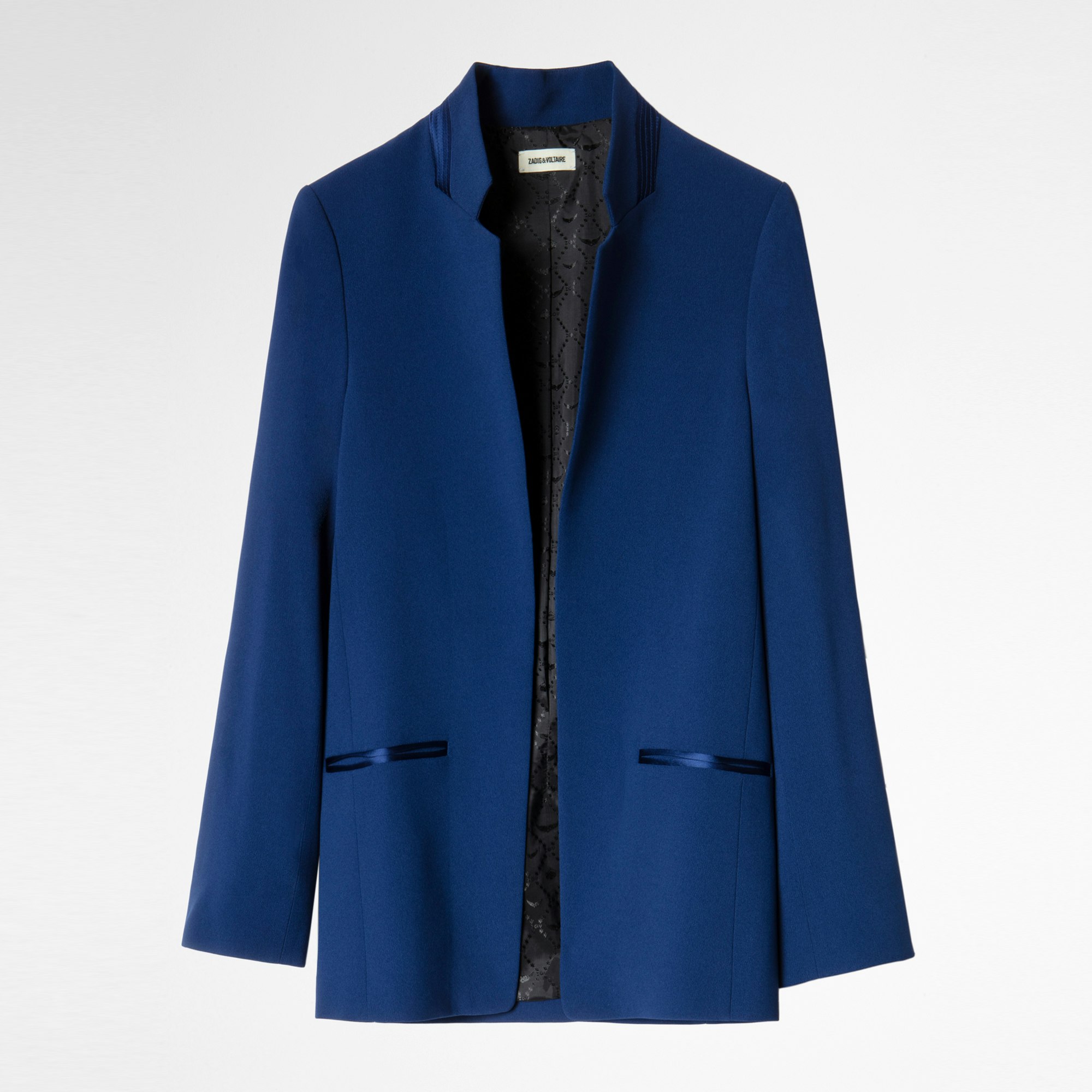 Blaue Damenjacke von Zadig&Voltaire, gerader Schnitt, Stehkragen, aus Kreppgewebe, Rückseite aus Satin, ohne Knöpfe, paspelierte Taschen.