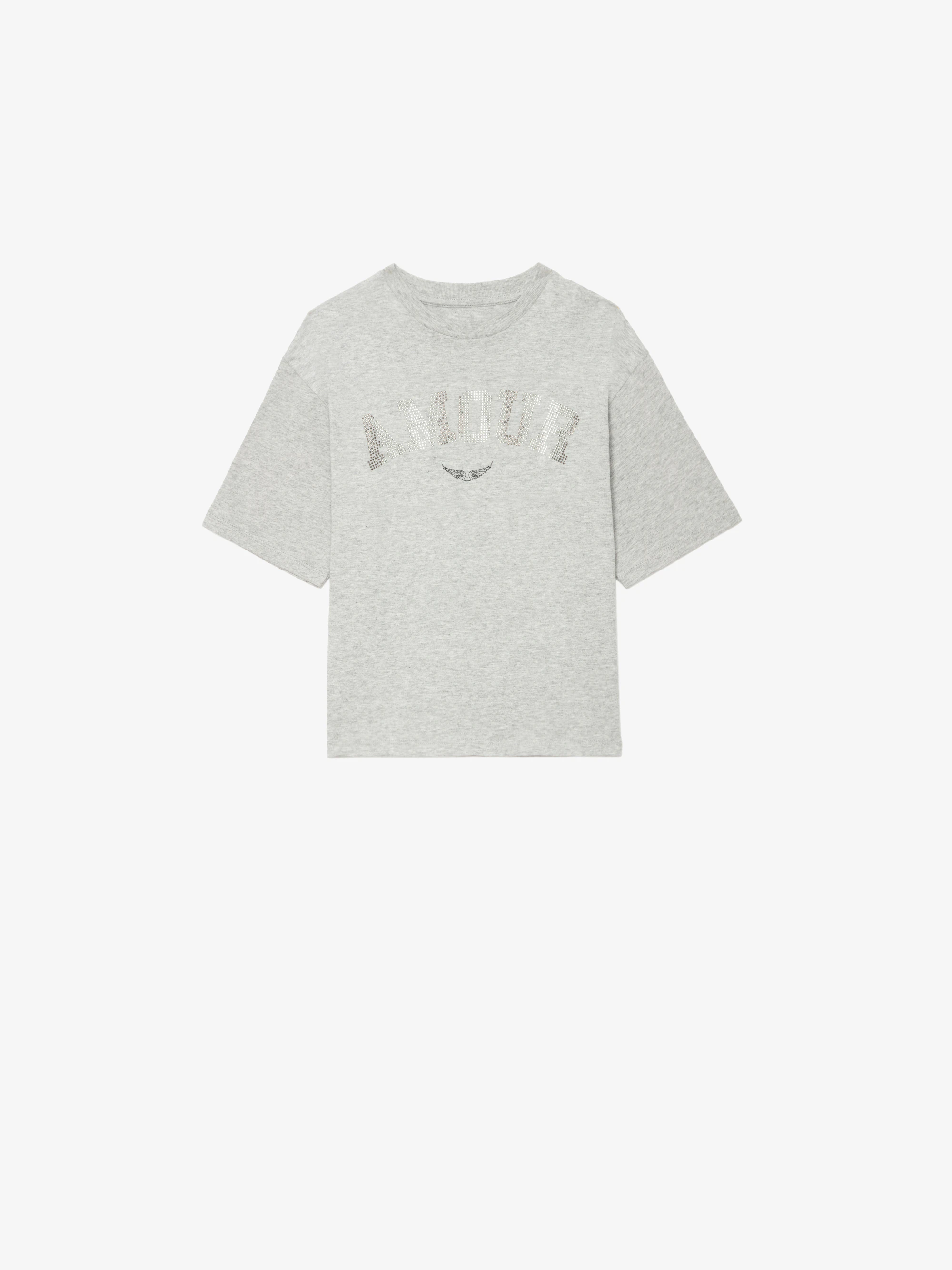 Heather grey cotton jersey T-shirt adorned with a rhinestone "Amour" illustration.See more