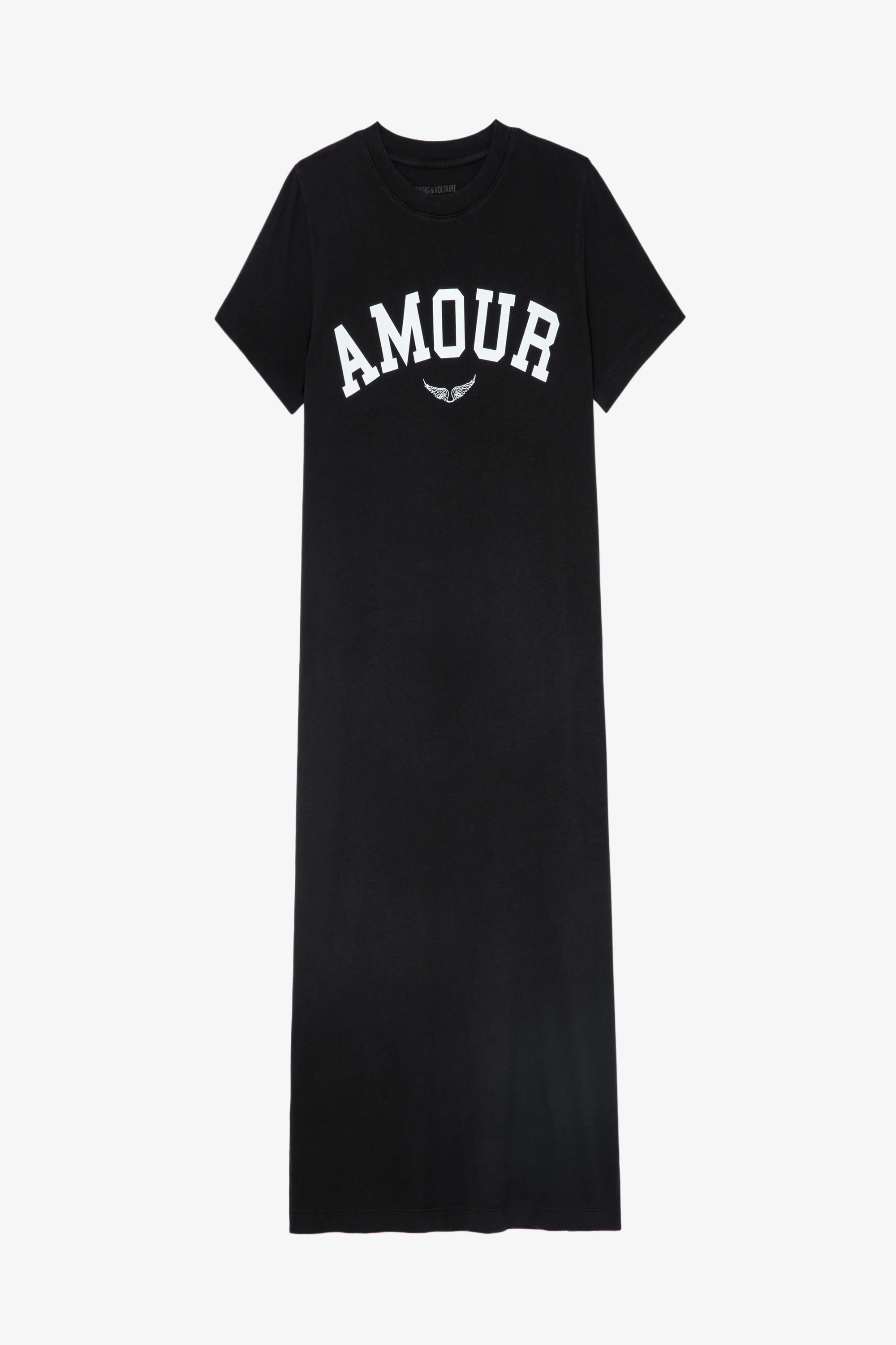 Women's long black cotton dress with "Amour" slogan and wingsSee more