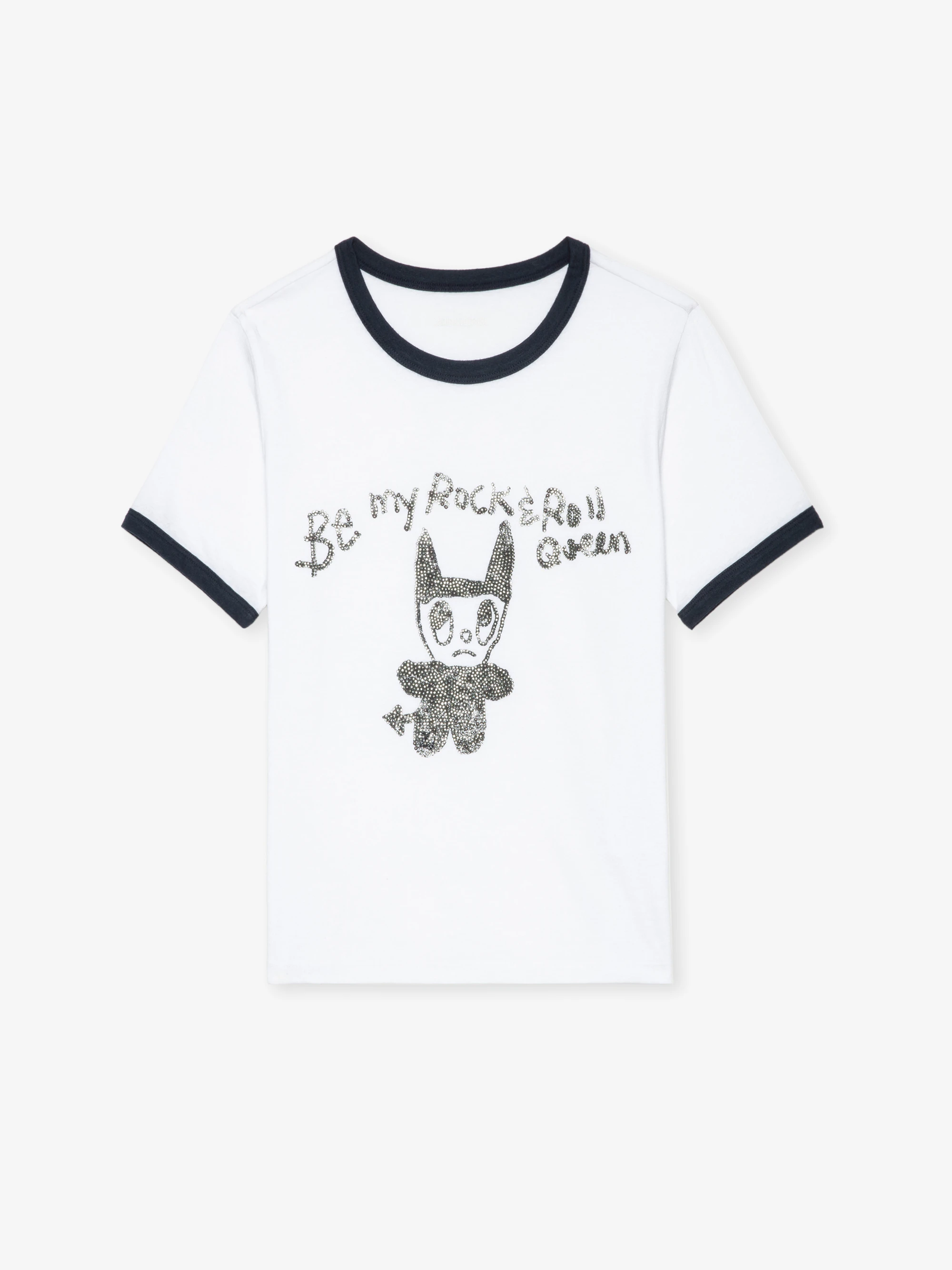 Round neck short sleeve t-shirt with contrasting hem and rhinestone devil queen custom on the front.See more