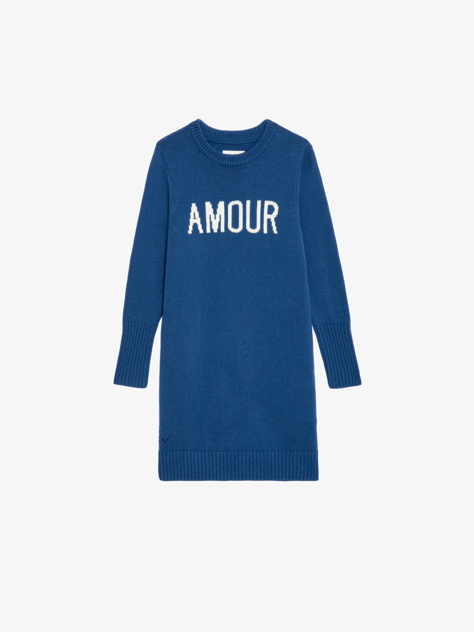 Girls' long-sleeved blue knitted maxi dress with "Love" message.