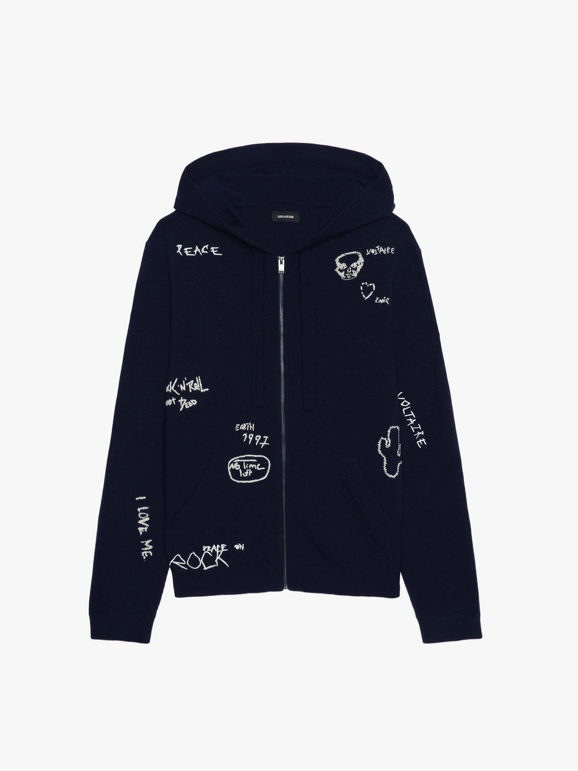 Navy merino wool and cashmere zip-up cardigan with long sleeves and engraved patterns.