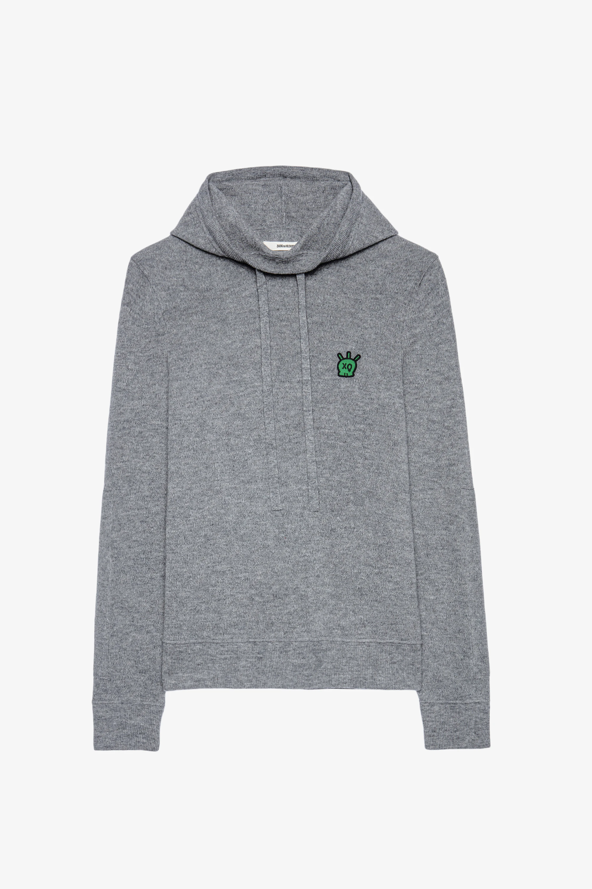 Men's grey merino wool hooded sweater featuring a Skull XO patch on the chest.See more