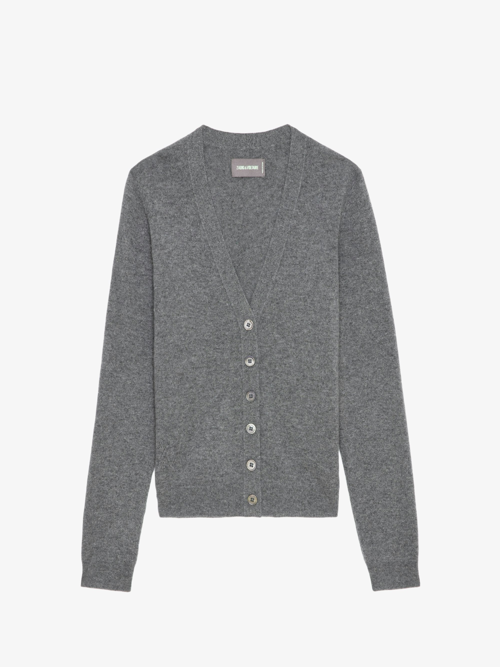 Mottled grey 100% cashmere cardigan with button fastening and star patches and embroidery on elbows.