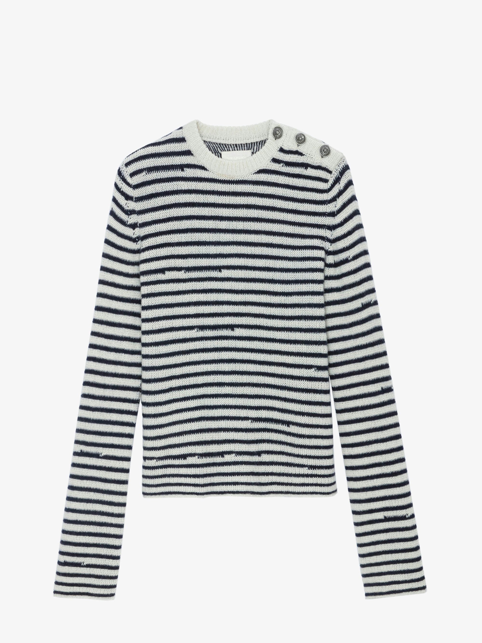 Women's striped ecru wool and cashmere sweater with buttons.See more