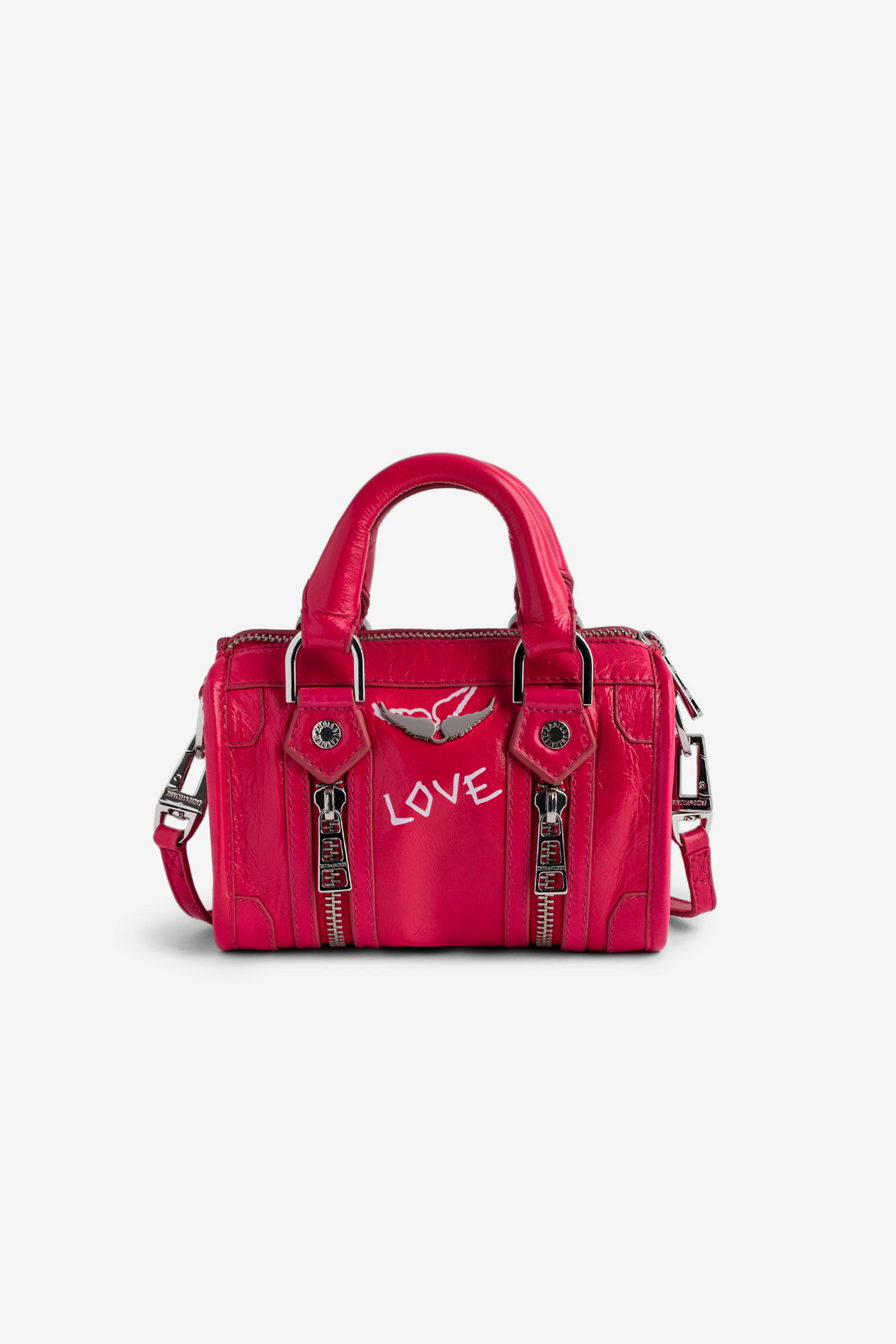 Women’s pink vintage-effect patent leather Nano bag with handle and shoulder strap with wings and “Love” tags.See more