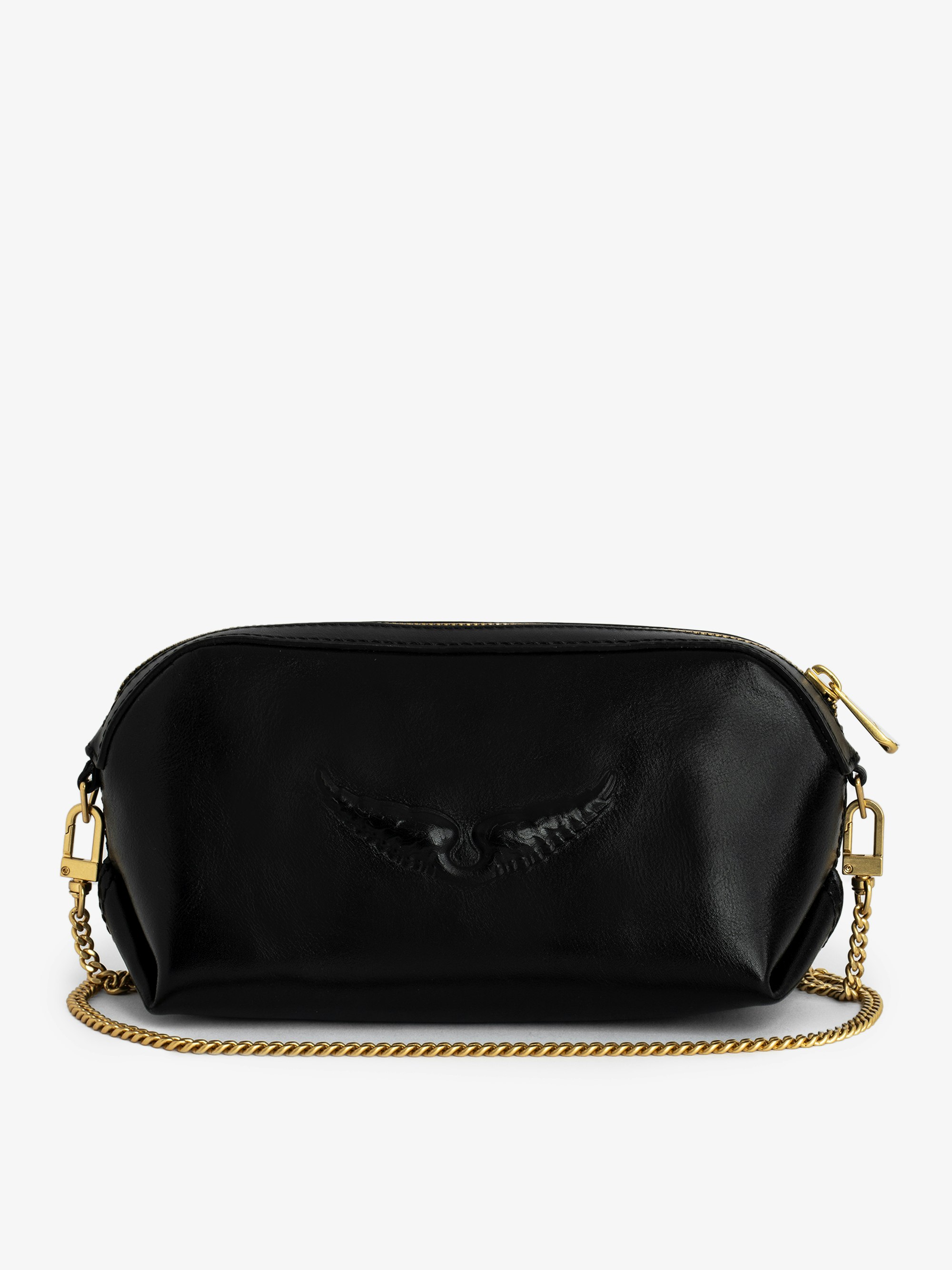 Small black vegetable tanned leather bag with removable gold-tone chain shoulder strap, made in Italy.