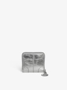 Metallic leather wallet with medallion and wing signatures.