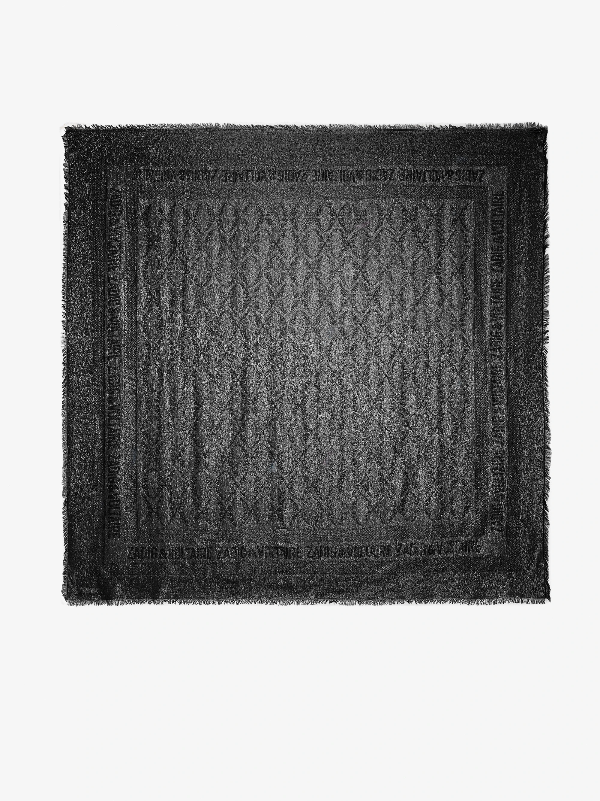 Silver rectangular scarf in fancy jacquard with patterns and signature.