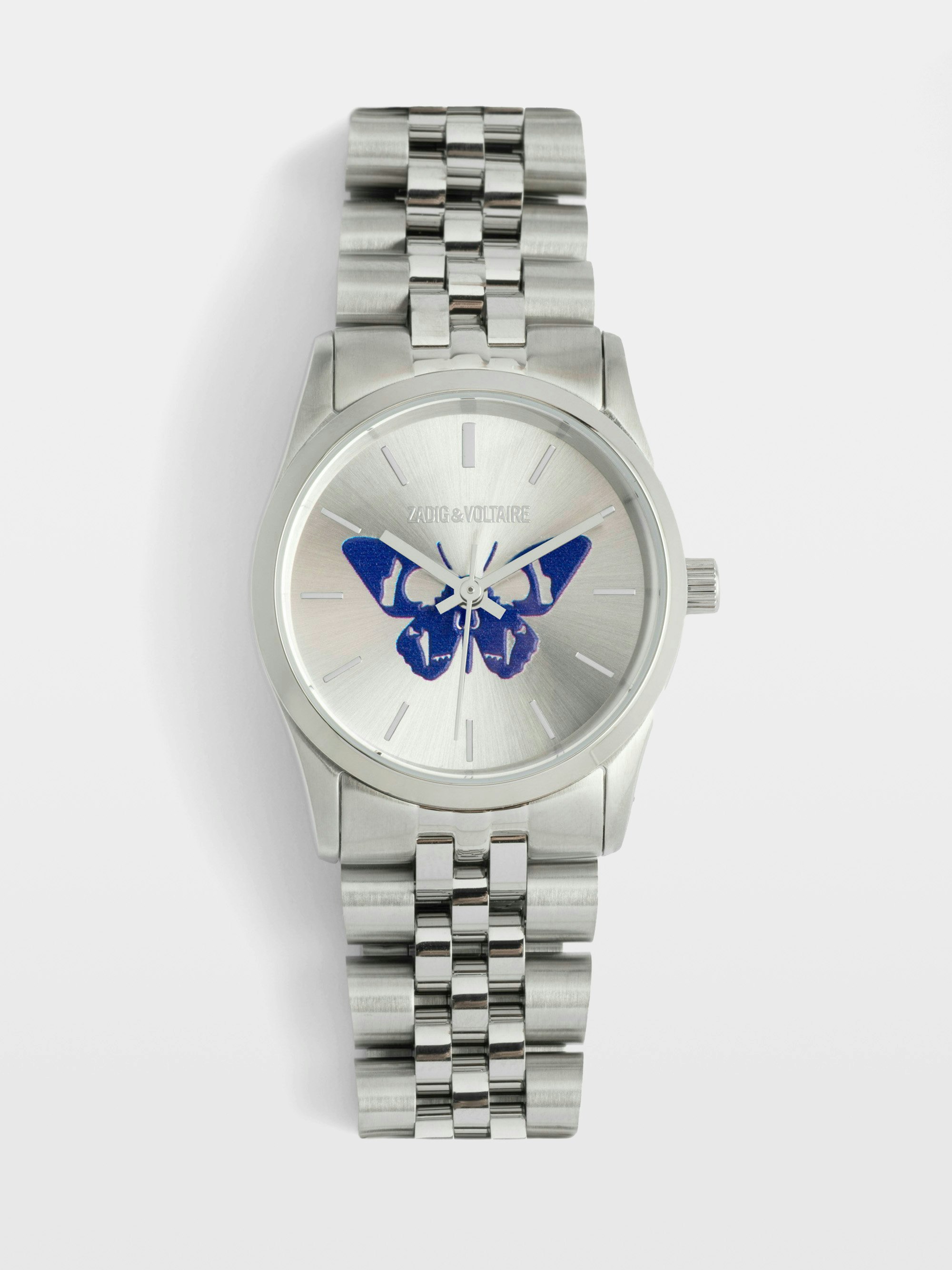 Stainless steel watch with silver dial featuring electric blue butterfly and steel bracelet.