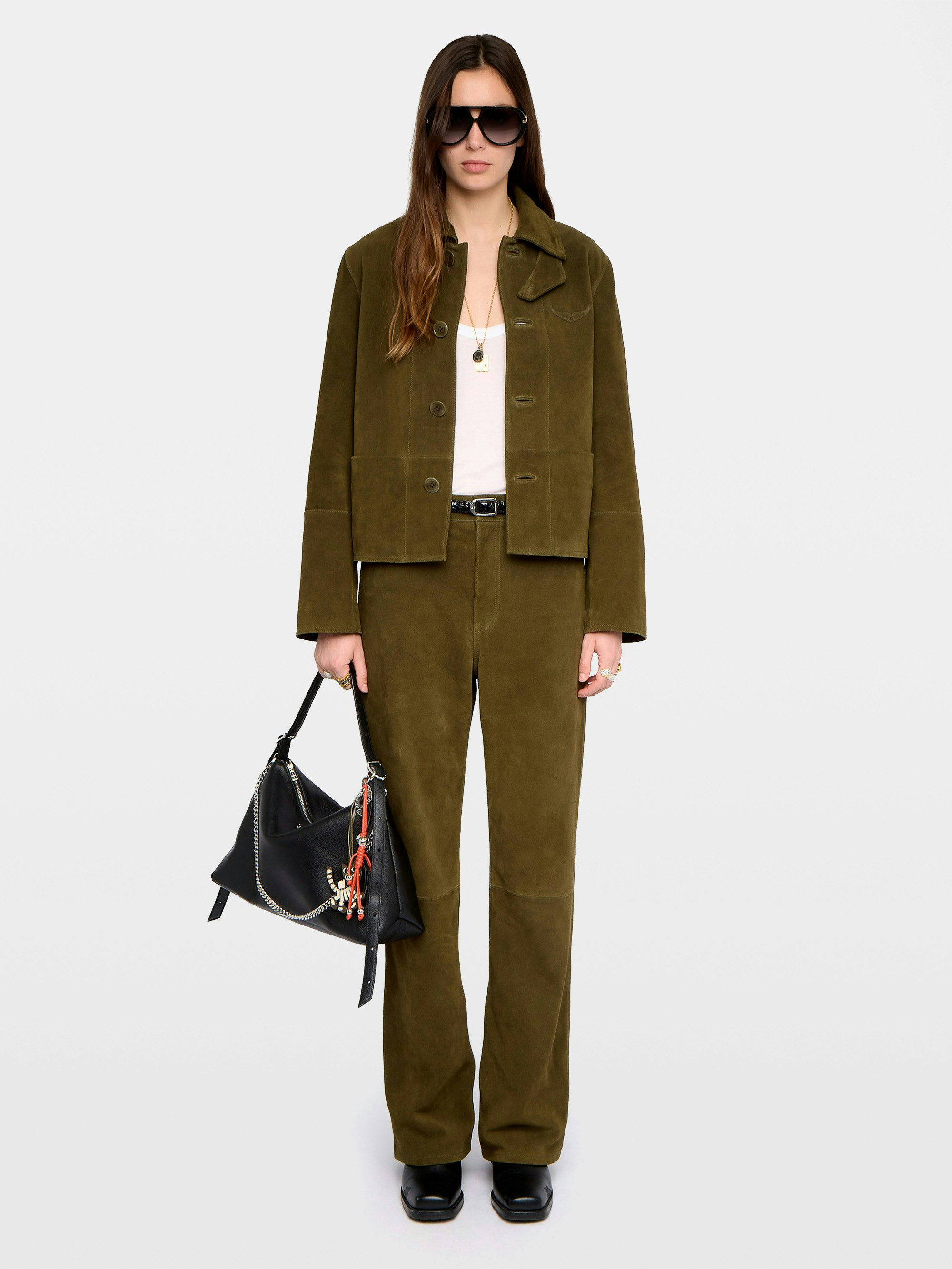 Short buttoned jacket in suede leather with deep dye effect and embossed wing.