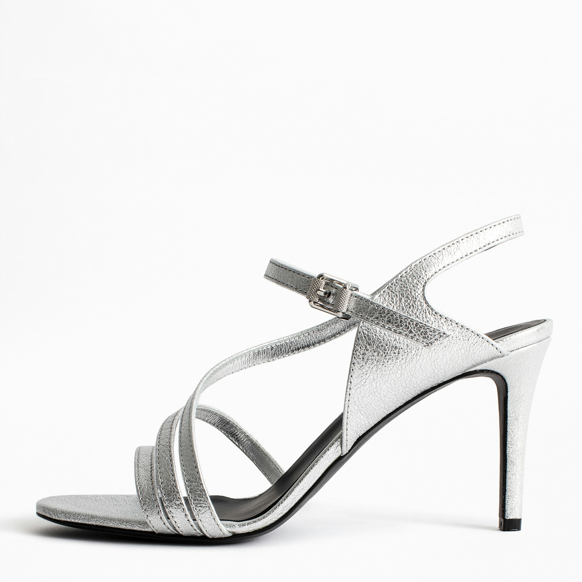 Zadig&Voltaire women’s sandals with silver-tone heels, sheepskin leather, crossover straps, Zadig buckle, star-shaped heel. Made in Italy. Heel height: 8cm.