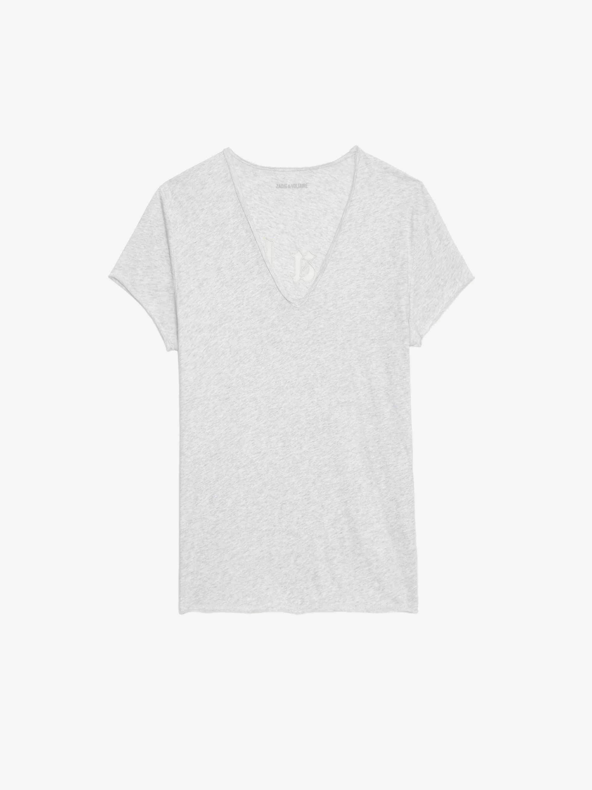 Camiseta gris jaspeado claro de algodón orgánico con mangas cortas y bordado fishnet "Call Me Baby" en la espalda.Ver más