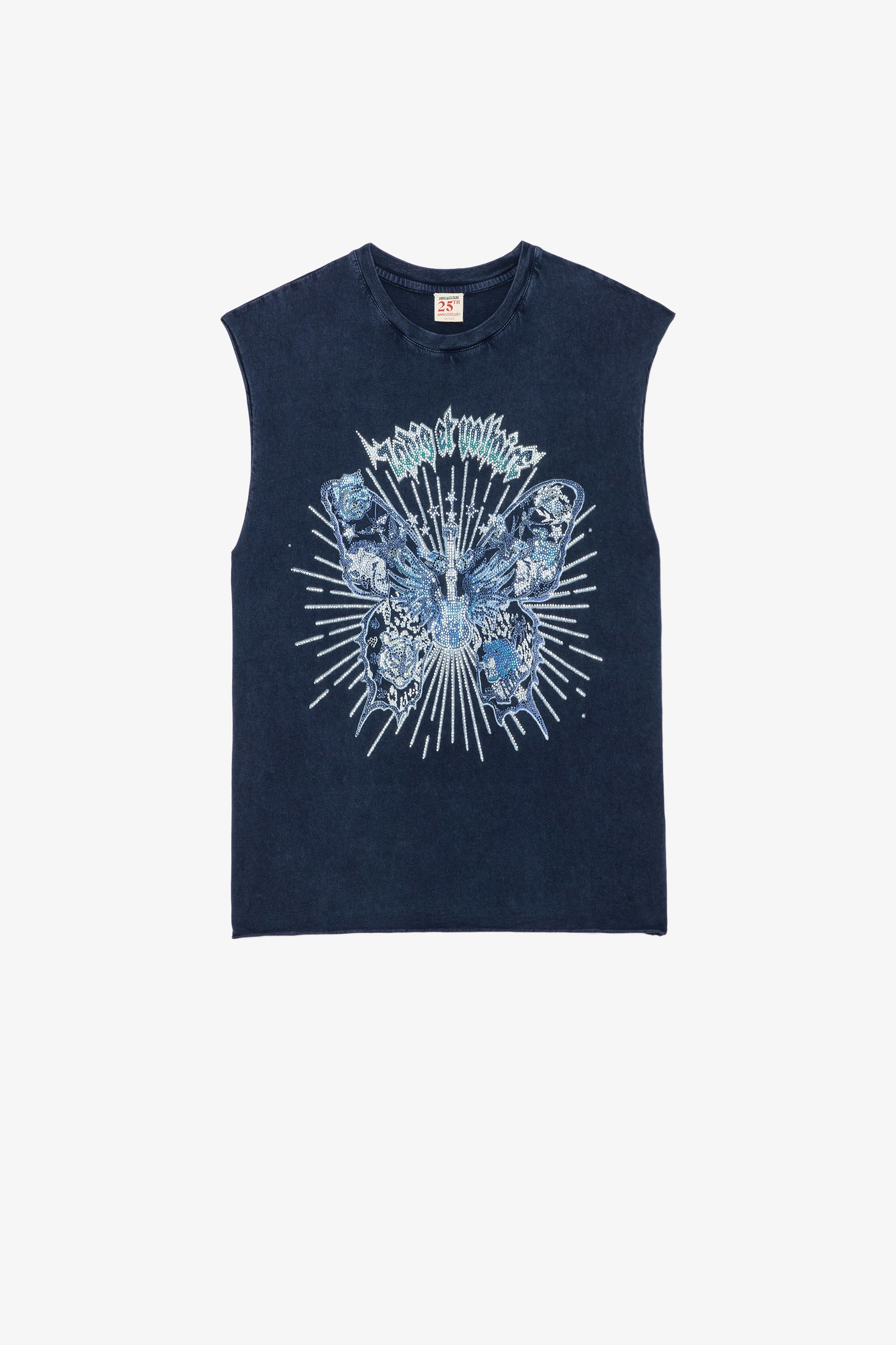 Camiseta de tirantes de algodón azul marino para mujer con estampado de mariposa con cristales