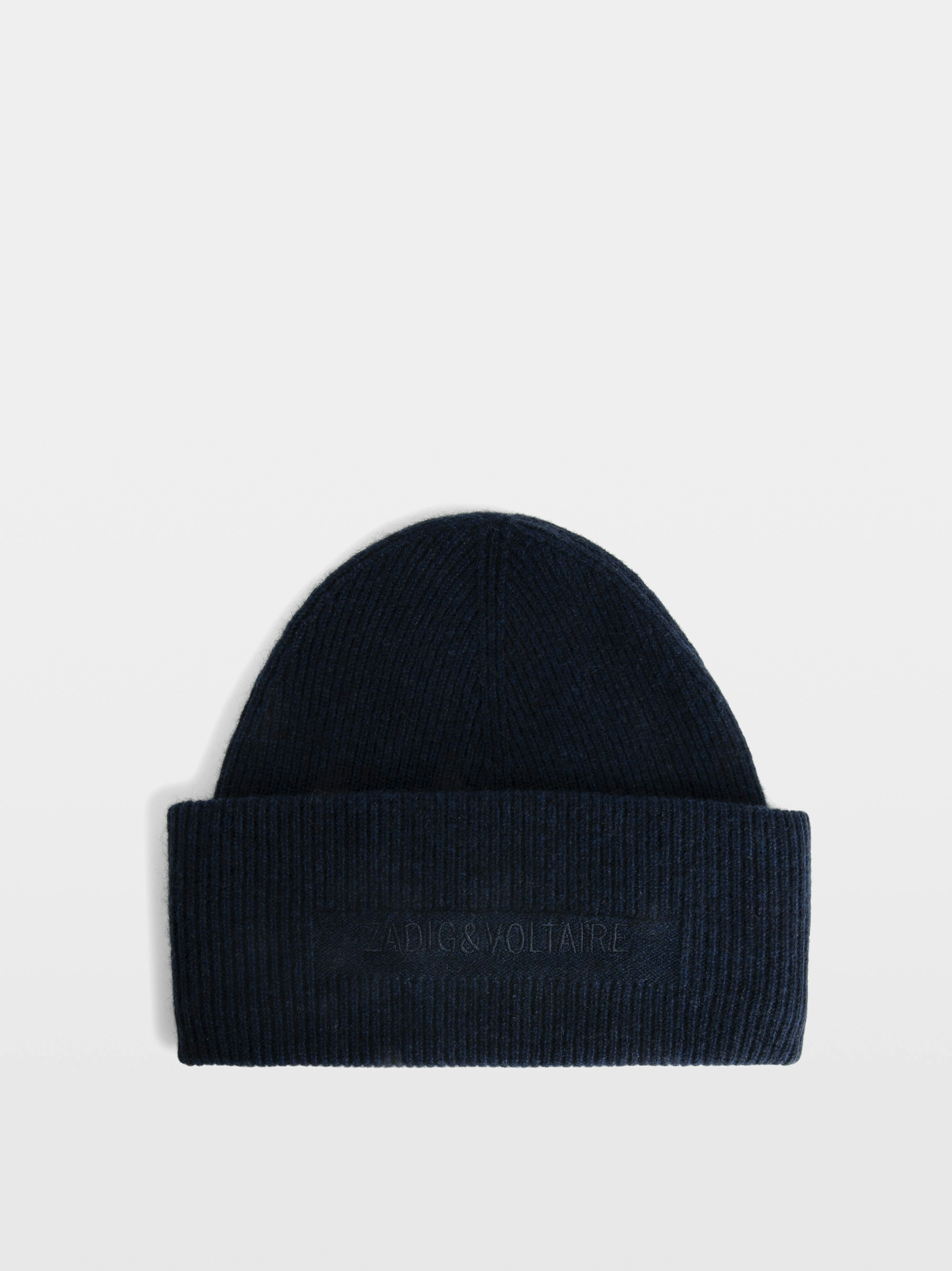 Gorro de 100% cachemir azul marino adornado con una firma.Ver más