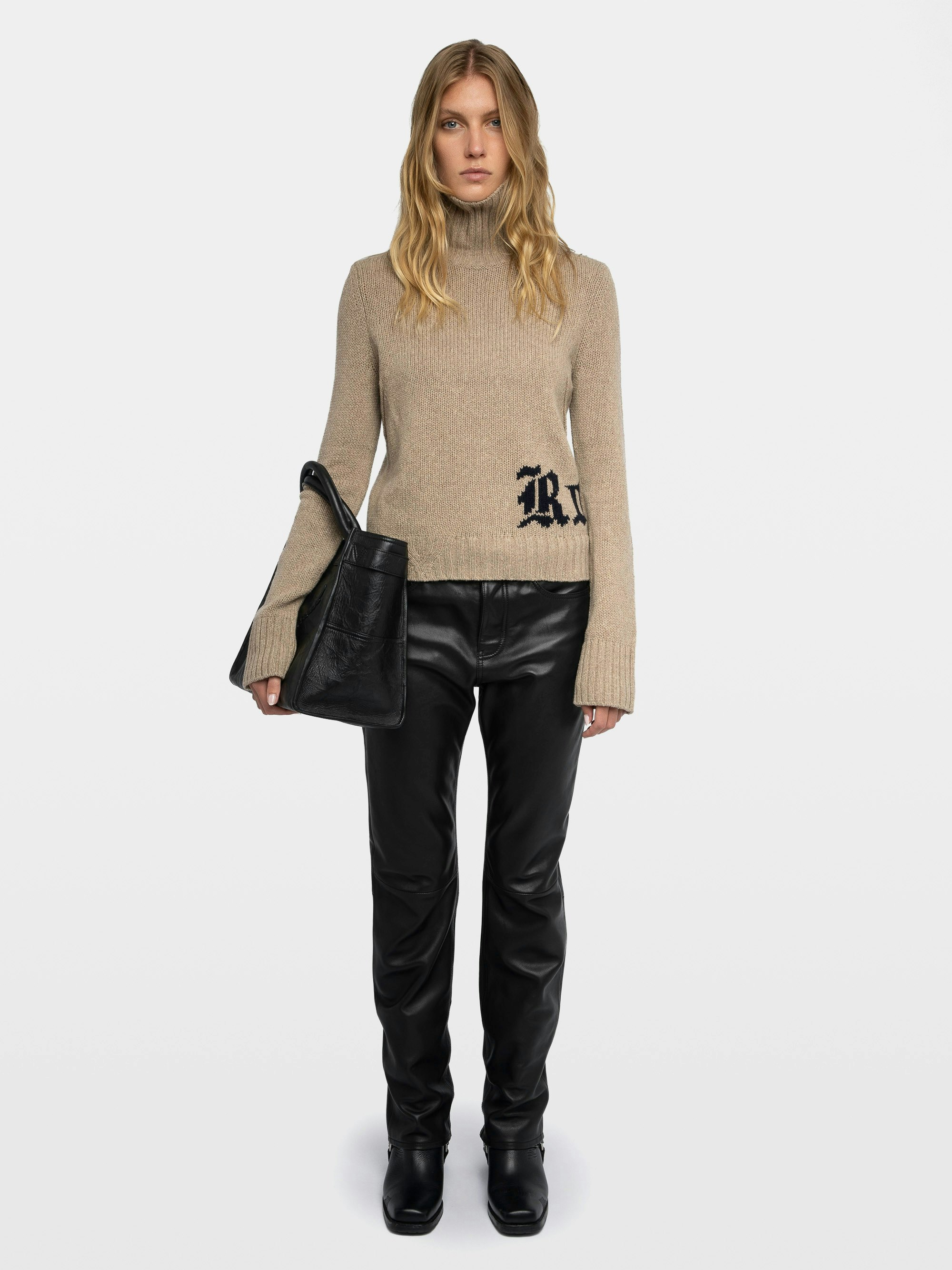 Jersey en 100% lana merino marrón claro con cuello alto e inscripción "Rock".