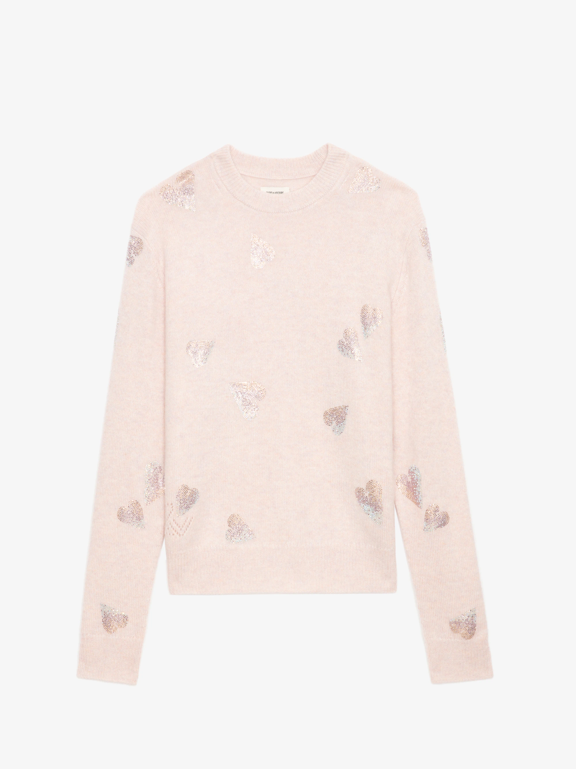 Jersey de 100% cachemir rosa claro con mangas largas y corazones adornados con cristales.Ver más