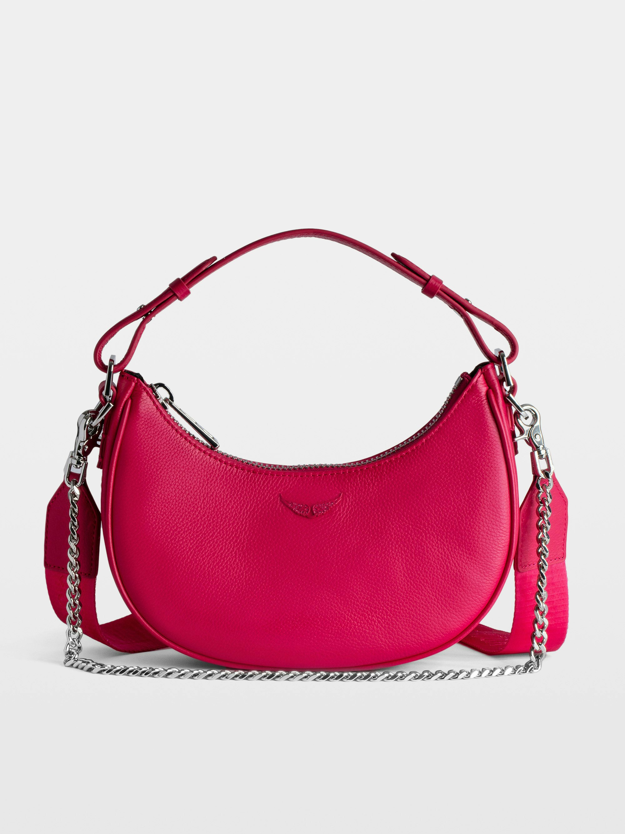 Bolso media luna en piel con asa corta, bandolera, cadena y adornado con las alas signature.